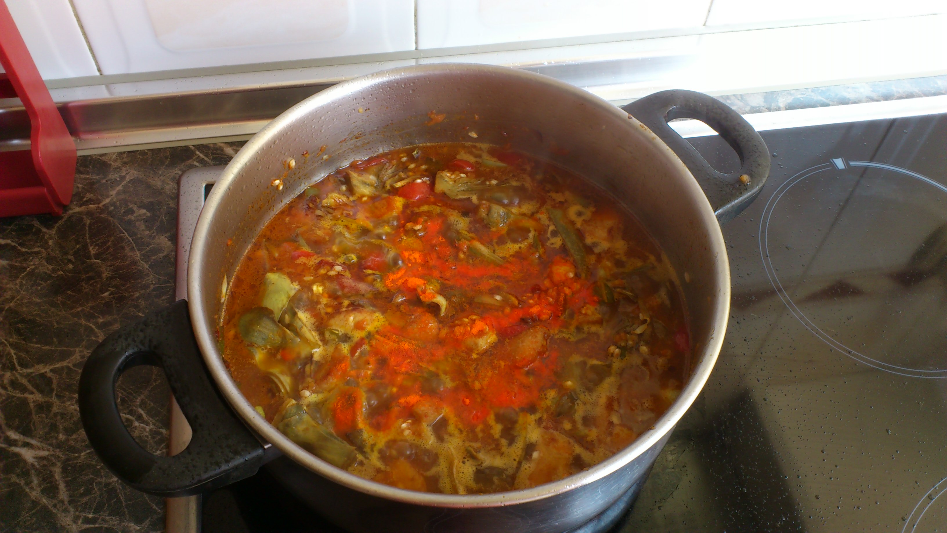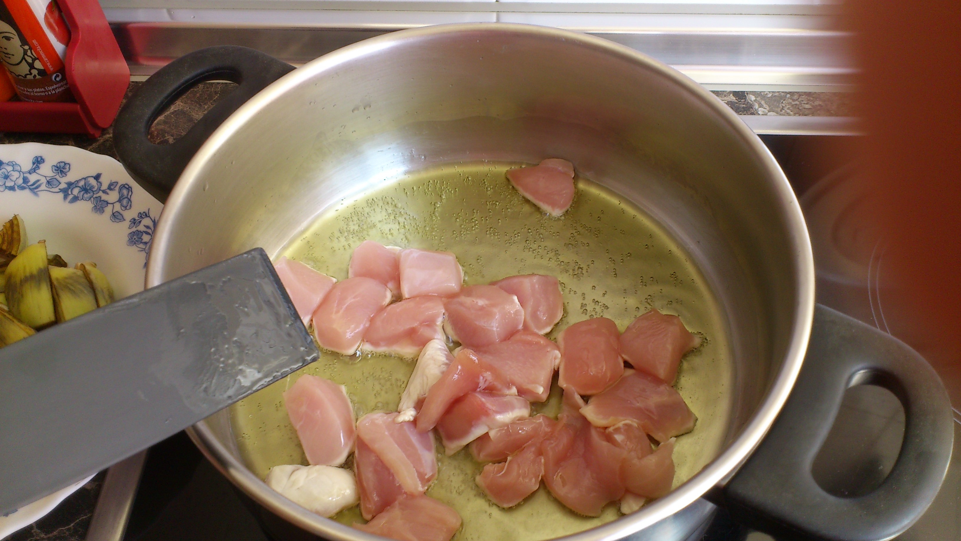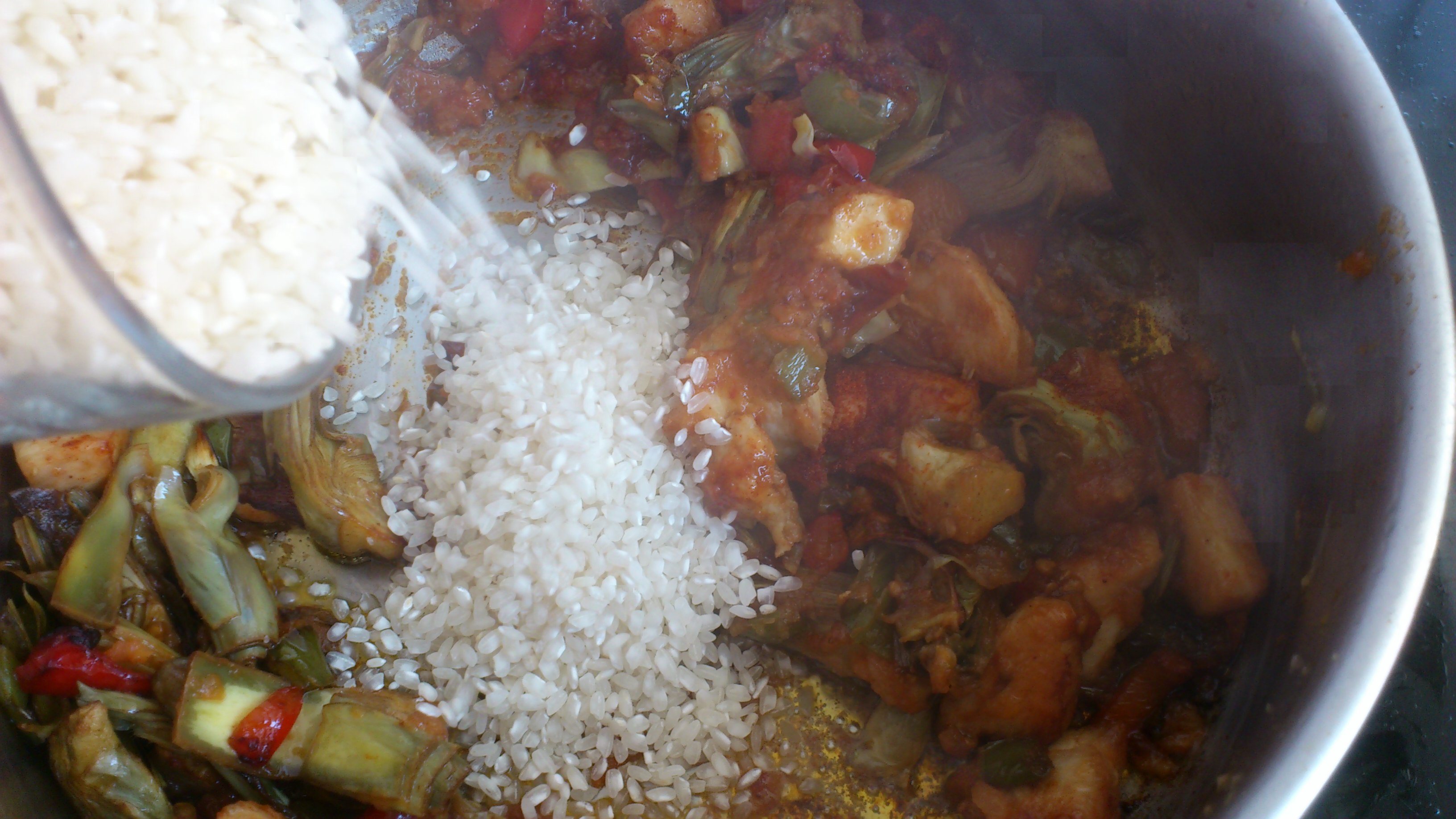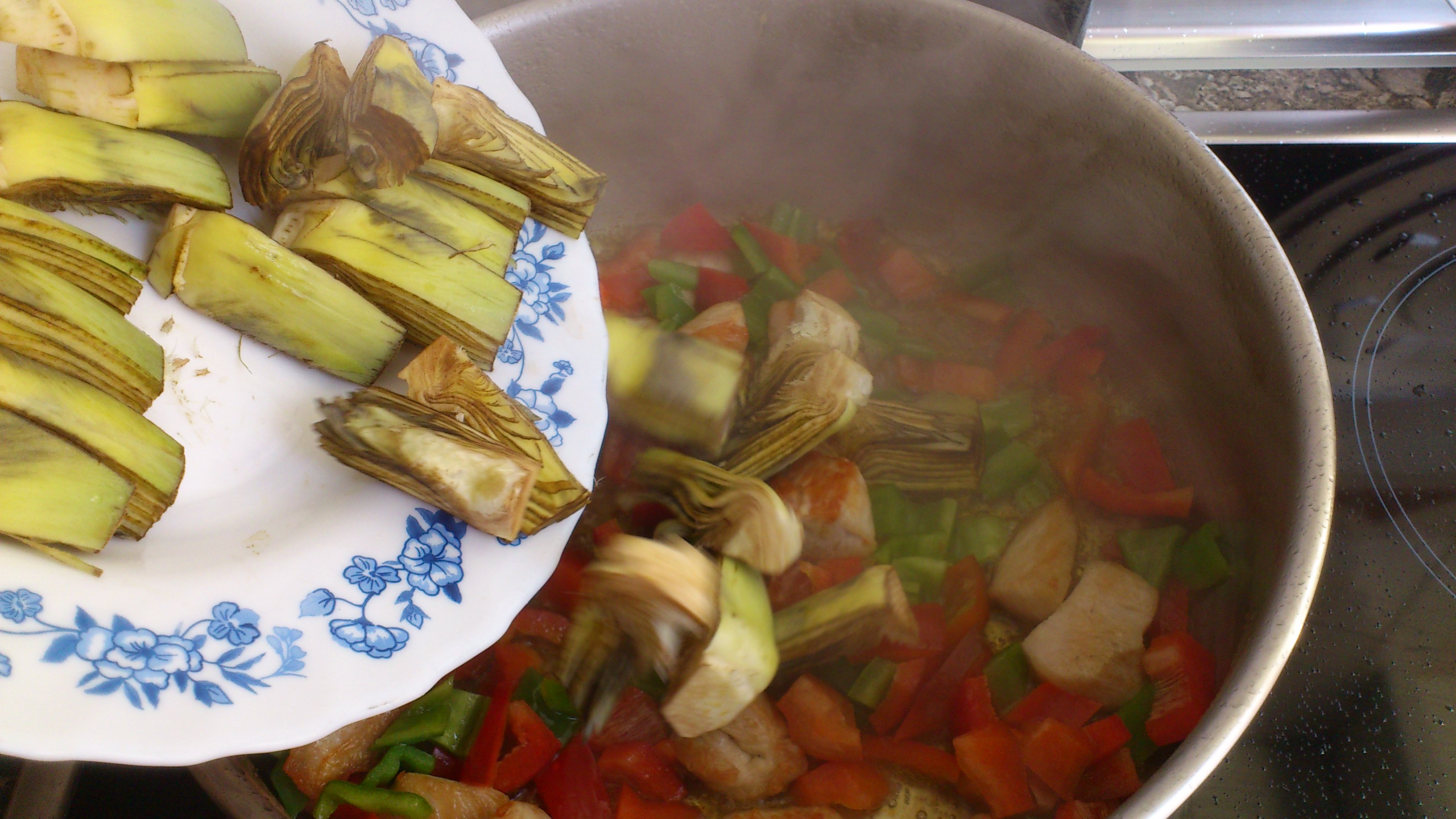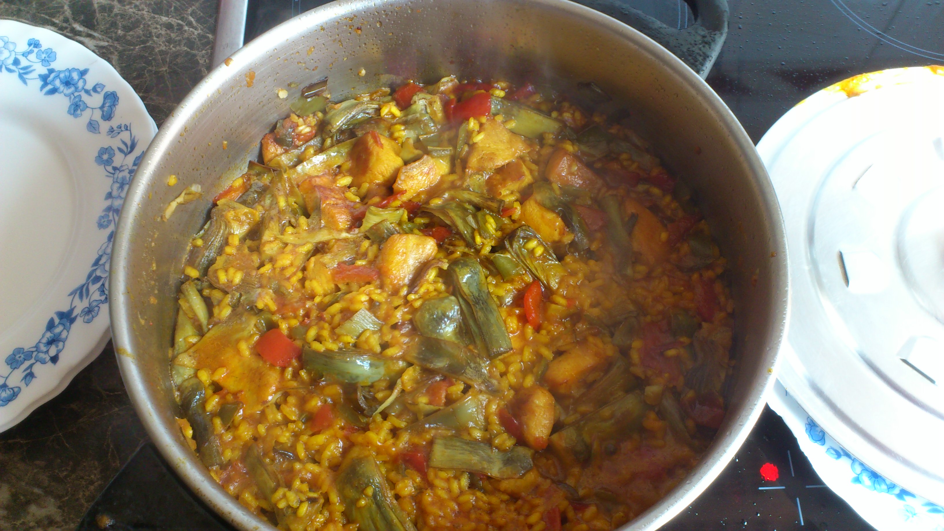 No hace falta paelló ni fuego de gas, basta una cazuela de acero y usar como fuego la vitrocerámica. De carne lleva una pechuga cortada a tacos que se va sofriendo en aceite de oliva, a la que se añaden como verduras unos pimientos a trocitos, unas alcachofas cortadas a gajos, un poco de tomate triturado. Cuando está listo el sofrito, se sazona con pimentón dulce en polvo en el momento oportuno y con una cucharadita de sal, se sofrie también el arroz (200 g= lo que cabe en un vaso de agua no muy lleno, para los dos). Luego se añade el agua (dos vasos y medio de agua por cada medida de vaso de arroz) y se tiene cociendose el arroz por espacio de 20 minutos exactos. Al principio tras añadir el arroz el fuego se pone al 3 ó al 4 y cuando va quedando poco caldo se pone al 2 ó al 1. Si nos quedamos sin caldo se añade un poquito más de agua. De forma que el arroz habrá estado hirviendo 20 minutos y quedará sin caldo y suelto.