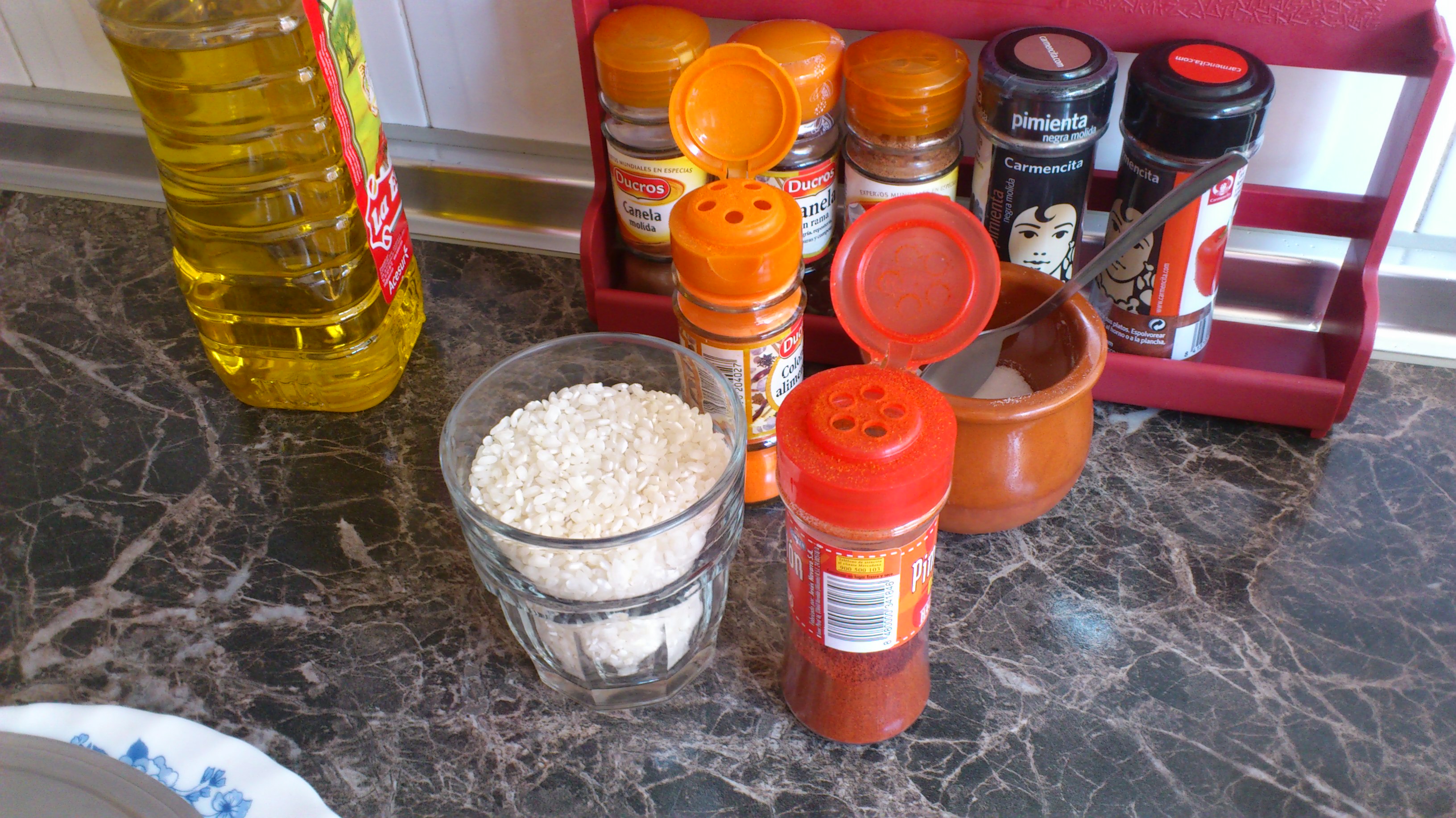El tomate se sofríe hasta que no se distingue y entonces se espolvorea un poco de pimentón dulce (una cucharilla de postre). Como se quema con facilidad se ha de tener preparado el arroz para echarlo enseguida.