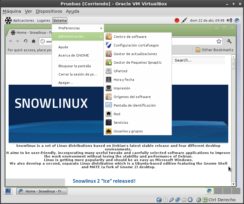 SnowLinux: En este escenario, ayer salió la versión 2 de SnowLinux ‘Ice’. Está basada en Debian squeeze, que es una distribución Long Term Support (LTS) hasta febrero de 2014. Esta distro trae varios escritorios, Gnome2, LXDE y XFCE y está disponible para 32 y 64 bits. Yo he descargado de la página de la distribución: http://snowlinux.de/ la versión con Gnome2 para 32 bits, la he puesto en la VirtualBox y la he instalado. Podéis ver una imagen de la misma funcionando (Fig. 1.-)