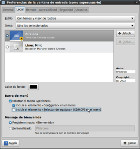 En la primera ocasión que he tenido he sustituido esta ventana de entrada en <MENU/Administración/Ventana de Entrada> eligiendo el otro tema que trae la distro por defecto. Se puede ver en la siguiente imagen (Fig. 2.-) el formulario donde se cambia la especificación de la ventana de entrada: