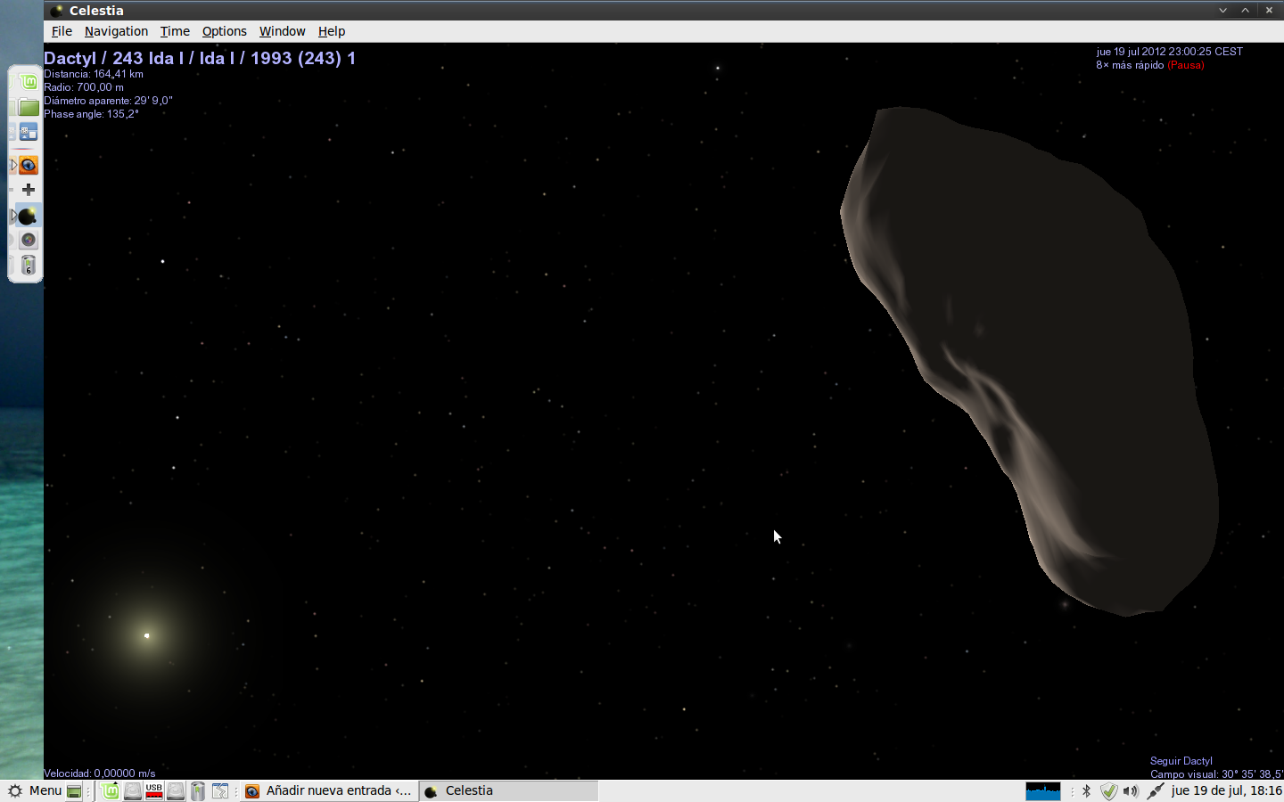 (Lo que vemos es el asteroide Ida, desde su compañero inseparable y mucho más pequeño Dactyl y al fondo el Sol. Ida tiene un radio de 28,9 Km y está en algún lugar entre Marte y Júpiter).