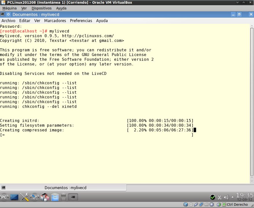 Y lo que me ha determinado a probar esta distribución tan distinta de mi círculo habitual es el llamado MyLiveCD. No está en el menú. Hay que ejecutarlo desde una terminal. Da como resultado la imagen ISO de un DVD que arranca en modo Live y que permite instalarlo en otro ordenador o en el mismo si falla todo. El ISO contiene todas las aplicaciones del sistema instalado en el disco duro en el momento de hacer el remaster. Este programa es mucho más lento que el que ya conocemos para los derivados de Ubuntu y Debian, Remastersys, pero parece bastante eficaz, a falta de pruebas más exhaustivas.