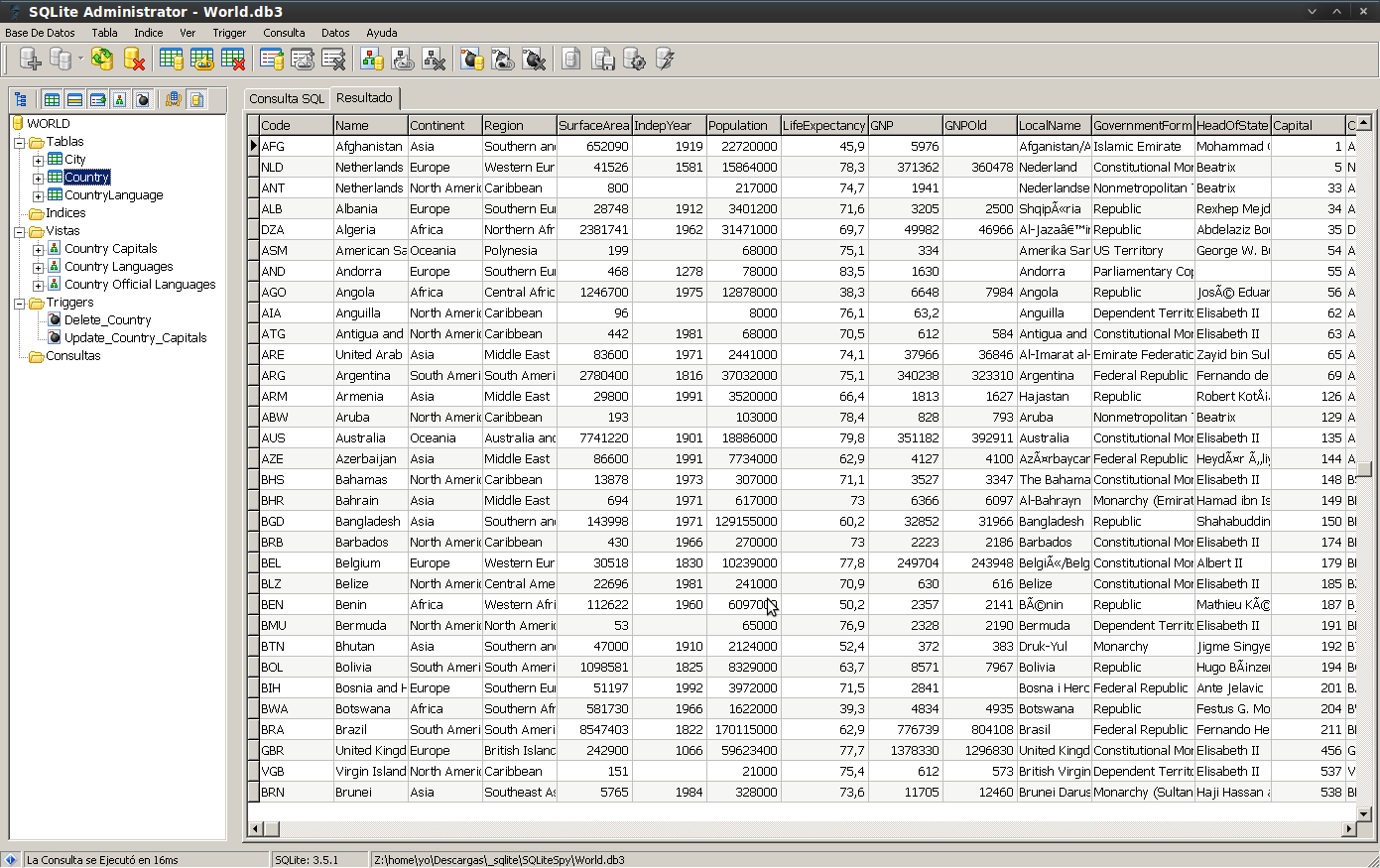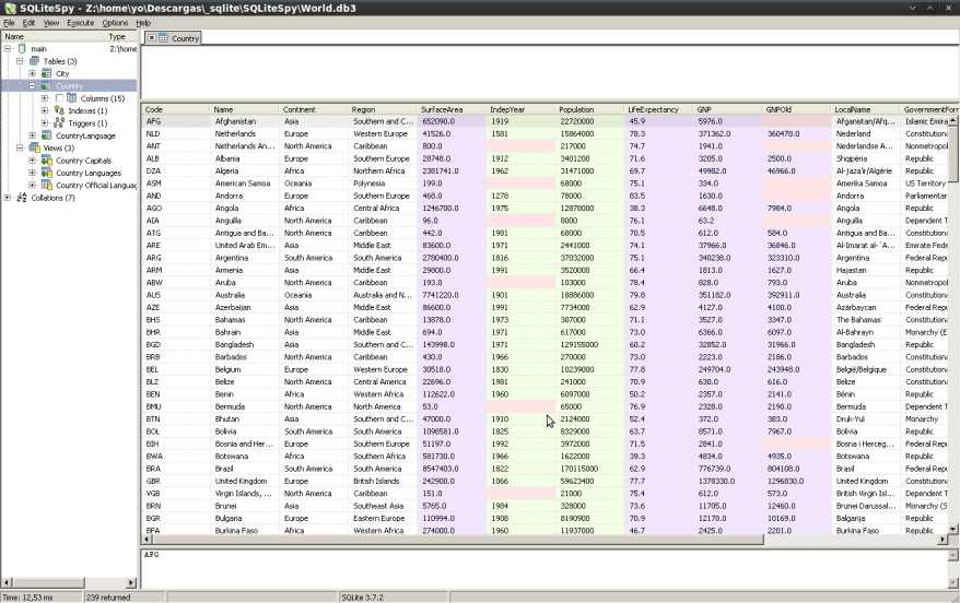 NOTA: Los datos que se muestran en todas las imágenes están tomados de una base de datos de muestra «World.db3» que viene con la distribución de SQLiteSpy