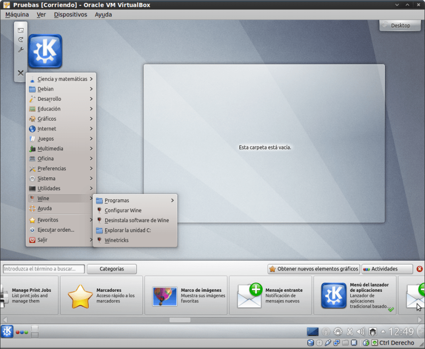 La segunda imagen corresponde al sistema Kubuntu 12.10, tuneado con mis aplicaciones favoritas, que he añadido clonando otra instalación anterior con ayuda de Synaptic, ya instalado en la máquina virtual a partir del ISO live y en el que estoy poniendo en el escritorio elementos gráficos que me interesan. En particular pongo un botón de arranque de aplicaciones, que me parece más sencillo que el botón de arranque que trae el KDE por defecto.