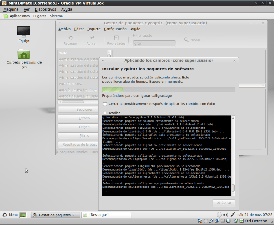 Instalé la distribución en una máquina virtual de VirtualBox y le instalé software adicional, mediante la utilidad de Synaptic para reproducir una instalación anterior (la que había hecho en Mint 13). Puede verse en la segunda imagen esa operación.
