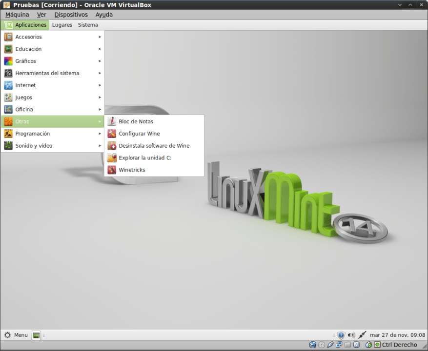 Es curioso que no aparece un menú específico para Wine, sino que sus entradas las coloca en el apartado del menú «Otras»