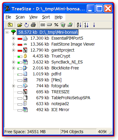 TreeSizeFree.- Cuando se trata de hacer limpieza en nuestros archivos, lo primero es conocer lo que ocupa cada directorio. Con este programa se consigue esta función con nota y se descubre que teníamos archivos que ni siquiera recordábamos. En la siguiente imagen se muestra lo que ocupa el directorio de la colección de programas que estoy presentando en este post (algunos son insultántemente pequeños).