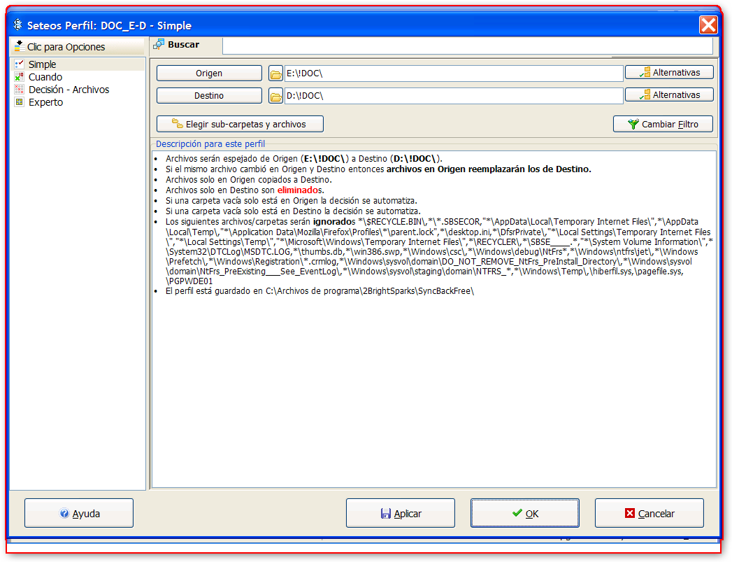 SyncBackFree.- SyncBack es un programa para sincronizar o respaldar dos directorios. A diferencia del Icemirror, permite definir perfiles de sincronización para operaciones entre directorios que se repiten periódicamente siempre igual y tiene una gran variedad de funcionalidades para hacer excepciones o respaldos totalmente personalizados. Como es de imaginar, su manejo es menos sencillo que el de Icemirror. yo uso los dos, cada uno para fines distintos.