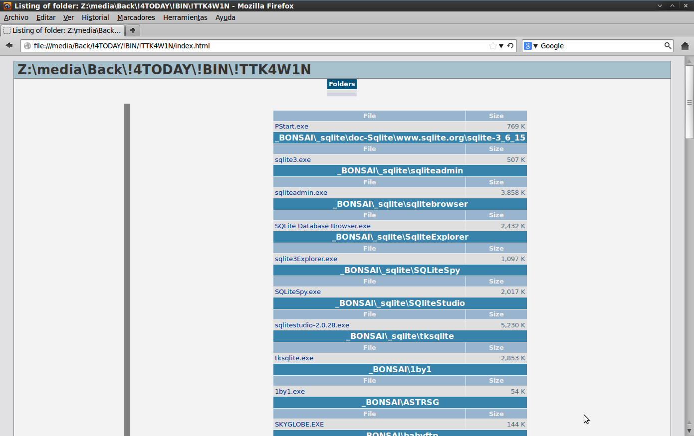 Ahora, sin embargo el mejor uso que le veo es hacer una lista de los archivos de trabajo de todo el año que guardo ordenados por asuntos. Abriendo el fichero generado por la aplicación y empleando <Menu|Editar|Buscar> desde el propio navegador (Mozilla), encuentro fácil y rápidamente lo que busco, ya que la búsqueda se reduce al contenido de texto de un sólo fichero (el generado por esta aplicación).