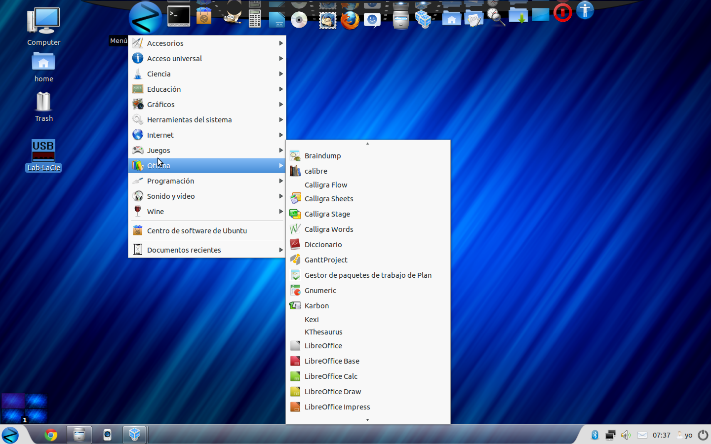 La instalación de un ISO de 3.2 Gb en un AMD de hace 5 años con 4 Gb de RAM, ha costado 18 minutos. Dos más para tenerlo en marcha. Algunas aplicaciones ayudan a hacer la vida más fácil. En la última imagen se muestra desplegado un menú que cuelga de un Cairo-dock que le he incluido en la parte alta de la pantalla.