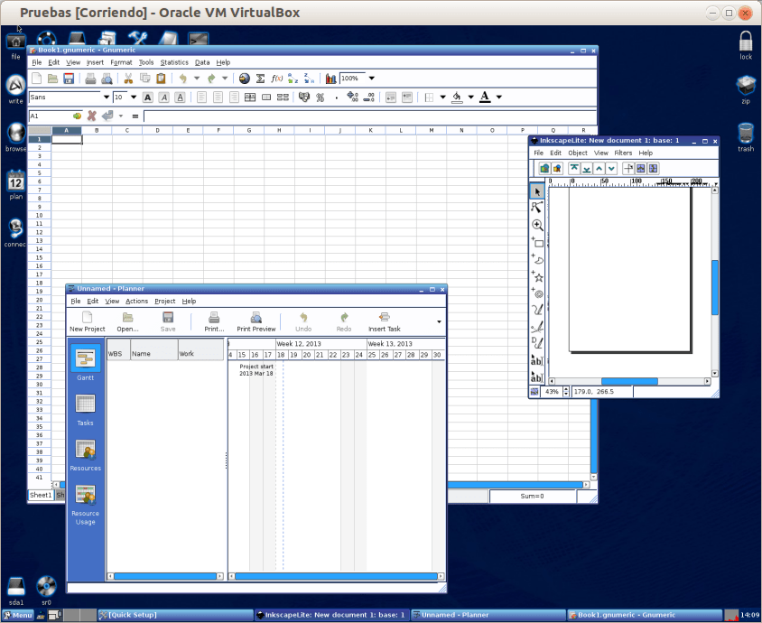 Alguna de estas aplicaciones está adaptada para que tenga un tamaño reducido, como por ejemplo inkscape, convertida en inkscapelite. Pero ¿quien emplea toda la enorme lista de funciones y filtros que traen las aplicaciones de diseño o cualquier otra clase? Como todo ya está cargado en RAM, la aplicación aparece en la pantalla casi antes de clicar su lanzador. En la siguiente figura pueden verse varias aplicaciones rodando a la vez: gnumeric, inkscapelite y planner…