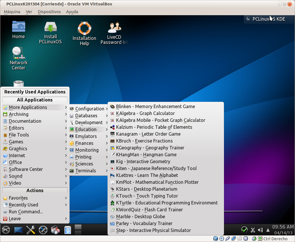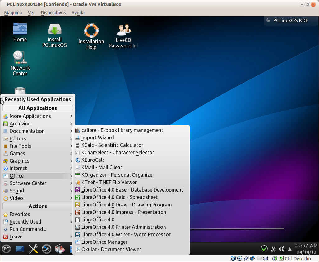 Junto a los muchos ‘buntus’ destaca este pedazo de Linux que es PCLinux, que no tiene que ver con ellos. El DVD de la distribución ha crecido de 1,3 Gb a 1,7 desde PCLinux 2012 a este 2013-04. La distribución en modo ‘live’ tarda un poco en arrancar en VirtualBox con 1 Gb de RAM, pero cuando lo hace descubres una maravillosa colección de software que debería bastar para la mayoría de usuarios de escritorio (excepto para gente como yo que queremos tener, además, Wine para hacer funcionar nuestros programas de Windows)