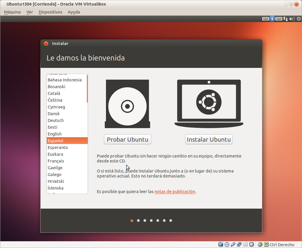 El caso es que al principio empieza bien, ofreciendo al arranque elegir el idioma y si quiero probar el sistema en vivo o prefiero instalarlo. Elijo probar.