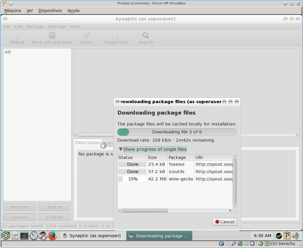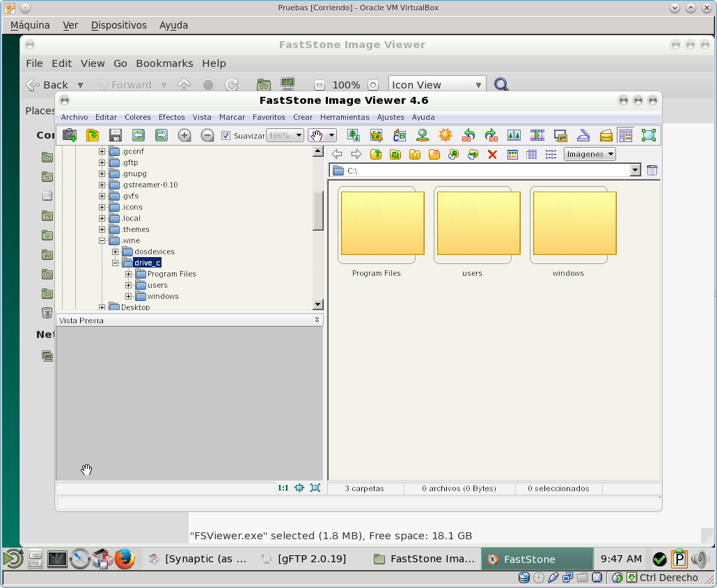 Una vez instalada la distribución en VirtualBox, he hecho varias pruebas, incluida la instalación de Wine y de gFTP. He descargado del host una aplicación para Windows, FastStoneImageViewer, y he comprobado que funciona perfectamente mediante Wine.