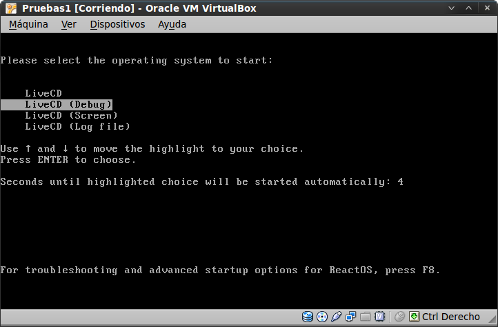 Si elijo la opción por defecto, LiveCD (Debug), a los pocos segundos, la pantalla se queda fija con este mensaje: