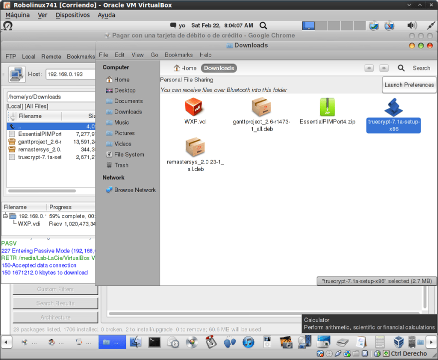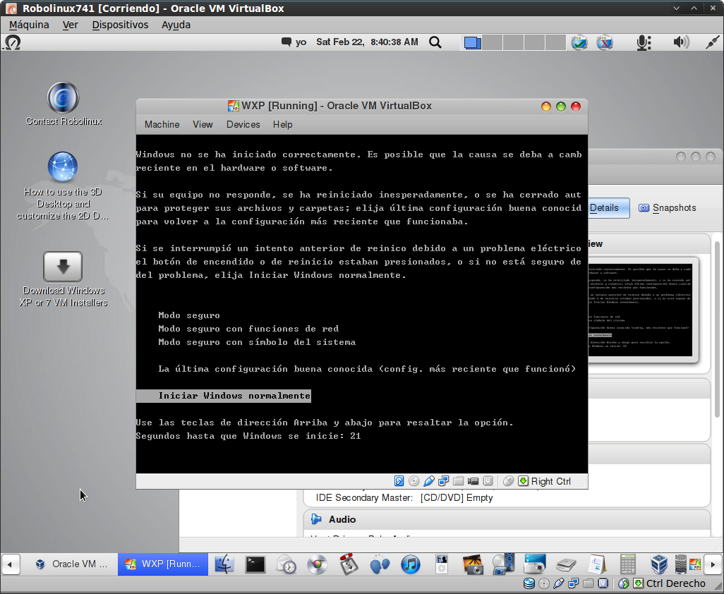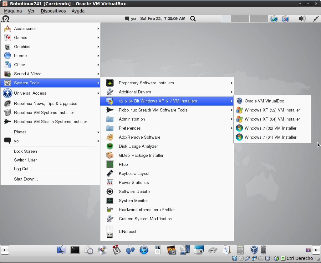 Robolinux incluye VirtualBox como parte de su distribución, y también varios programas que facilitan la instalación de máquinas virtuales de Windows XP y de Windows 7 para sistemas de 32 y 64 bits en muy pocos clicks. Para completar la descarga de estos programas hay que pagar 1 euro por cada uno,. Su idea es hacer correr Windows dentro de Linux sacando partido de la seguridad que aporta el host de Linux y la facilidad de recuperar un sistema incluido en una máquina virtual, pues en general basta con copiar un archivo que corresponde al disco virtual del sistema en un momento en que funcionaba correctamente. Con esta filosofía Robolinux hace de la virtualización virtud. Incluyo imágenes de las pruebas: