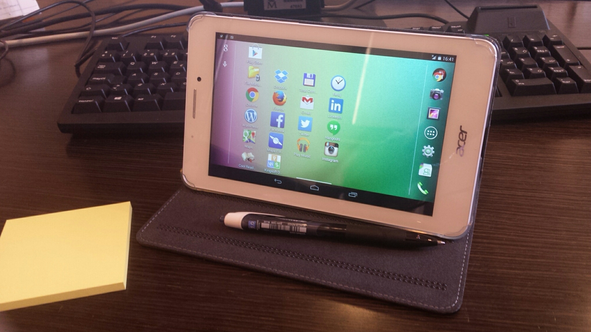 Si nos atenemos al tamaño de la Acer Iconia Tab 7 A1 713HD estamos ante una tableta muy manejable, que dispuesta en sentido vertical cabe en una mano mientras se maneja con la otra, con un potente procesador MediaTek de cuatro núcleos a 1,3 GHz, con 1 Gb de RAM y 16 Gb de almacenamiento interno (ampliable con tarjetas microSD de hasta 32 Gb), con Android (4.4.2) como sistema operativo y una pantalla de gran ángulo de visión, con resolución 1280*800 pixels (mayor de la que tenían las pantallas de PC de 17″ hace unos pocos años).