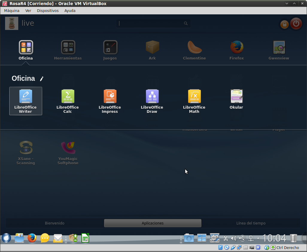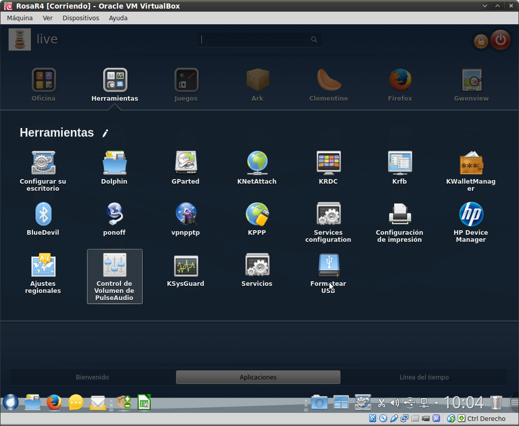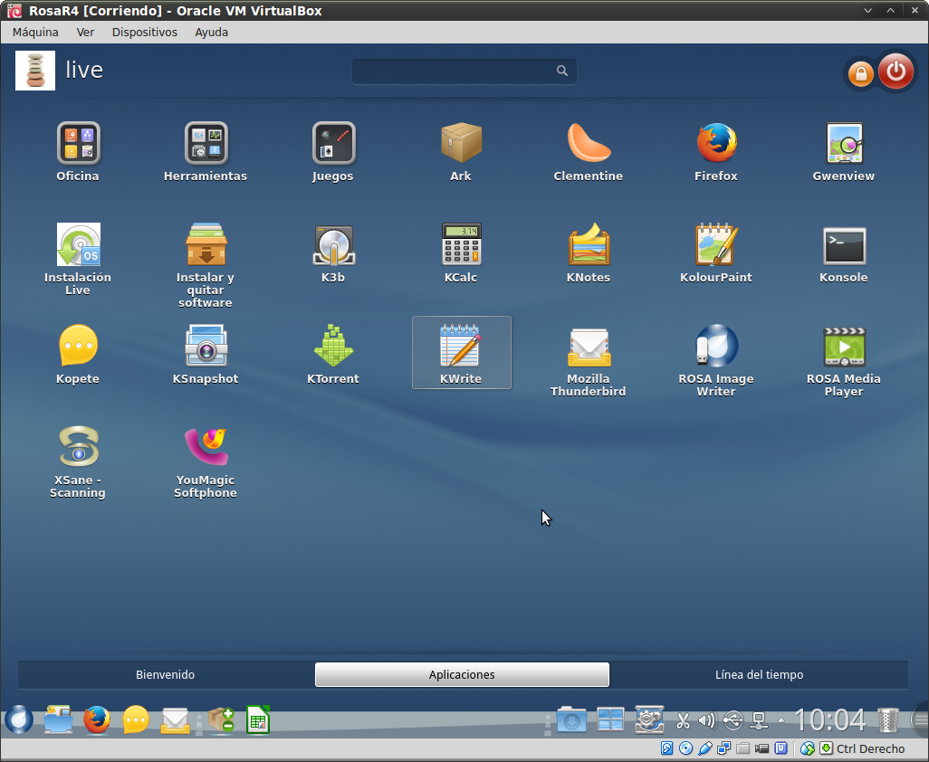 Al arrancar, un mensaje emergente meinforma de que se necesitan al menos 2 Gb de RAM para funcionar correctamente. Después de cambiar la RAM asignada a la máquina virtual a 2 Gb y volver a arrancar el sistema, obtengo un escritorio KDE limpio y ordenado. Al pulsar el botón de inicio aparece un menú de iconos en la pantalla, que está dividido e tres apartados: lugares y aplicaciones recientes, menú de aplicaciones y línea del tiempo (de la que no tengo idea de cual es su utilidad), que enlaza a su vez con iconos de documentos locales y de redes sociales.