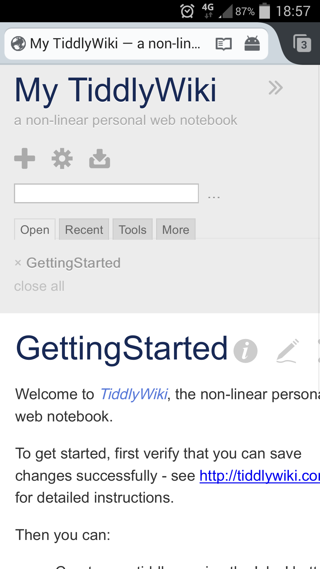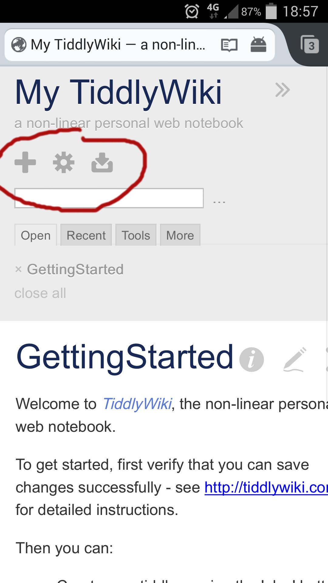 Hay muchos programas que pueden servir para tomar notas y recuperarlas ordenadamente más adelante. Imagina una página web donde pudieras escribir, modificar y añadir contenidos, con el navegador de internet. Eso ocurre muchas veces, pero la página en cuestión suele ser en realidad un formulario de una base de datos. Sin embargo, como puede verse en Wikipedia, Tiddlywiki es un sólo archivo, tipo web, o sea HTML, que en su interior contiene los elementos necesarios de programación (basada en un lenguaje para dar vida a las páginas web llamado javascript -que no hay que confundir con java-). El código que encierra un archivo Tiddlywiki permite ir añadiendo anotaciones con título y palabras clave, que el propio archivo permite buscar luego, como si de una base de datos documental se tratara. Sin entrar en detalles de programación, ni tener conocimiento de informática se puede descargar de la página de Tiddlywiki un archivo ‘Empty’ (vacío) y empezar a usarlo como blog. Las imágenes que incluyo lo explican. El mismo archivo puede ‘correr’ independientemente del sistema operativo, sea Windows, Linux, MacOS, Android. He puesto un ejemplo hecho con Android porque hoy en día ‘todos’ llevamos siempre encima el smartphone y es una nueva forma de tener los pensamientos que se nos ocurren a mano. Una vez descargado el archivo, lo he localizado en /storage/emulated/0/Download (que es el lugar de almacenamiento interno de mi teléfono Samsung), y lo he renombrado como ‘Siriowiki.html’ para tenerlo controlado. En la última imagen se puede ver.
