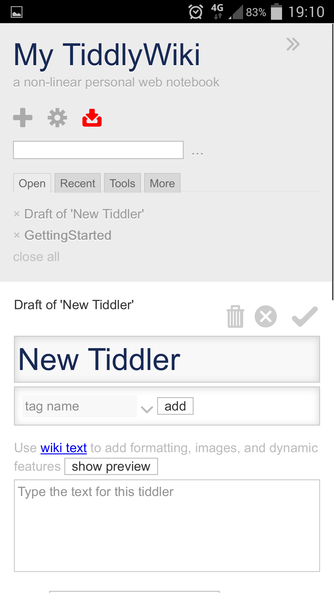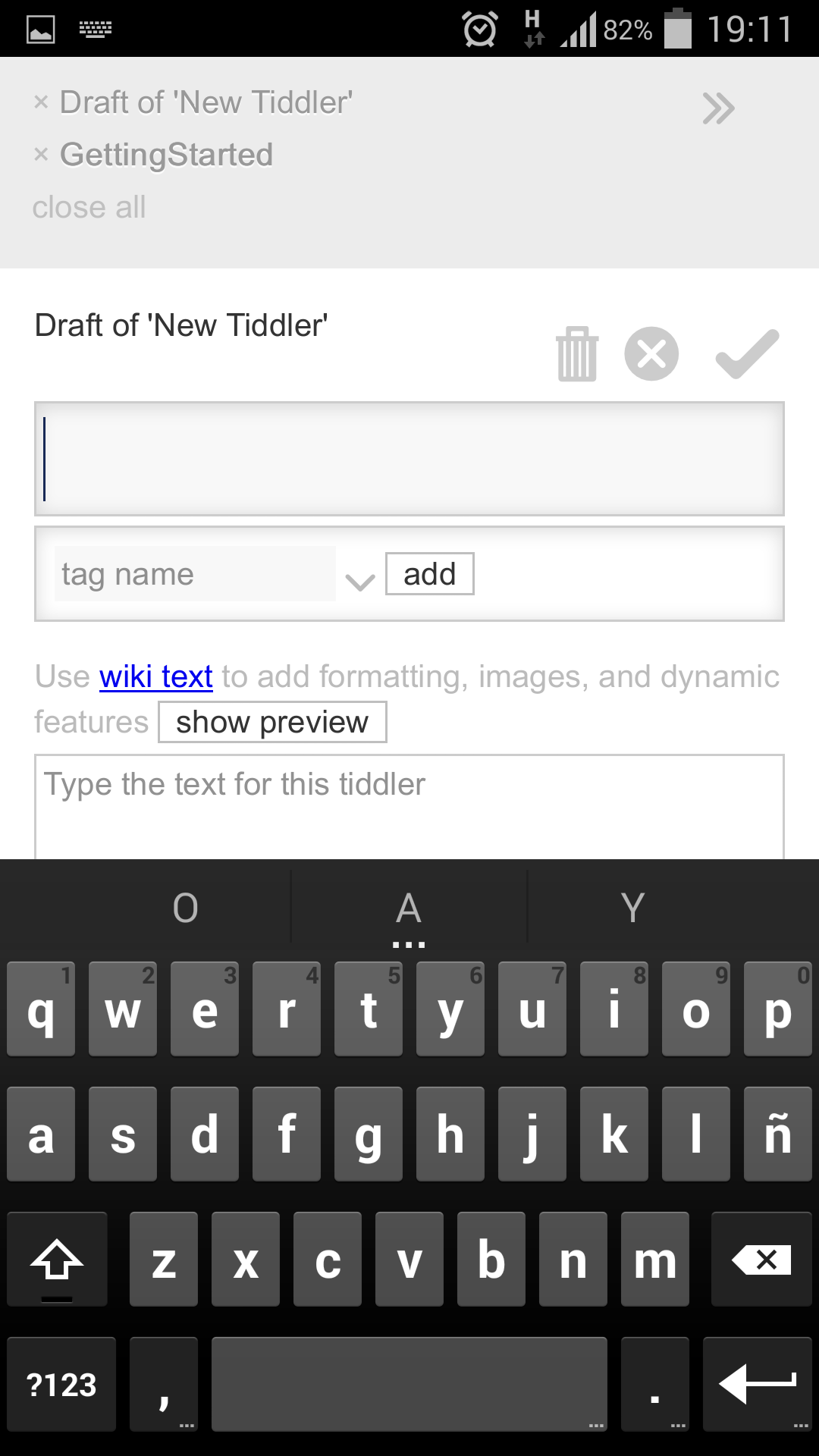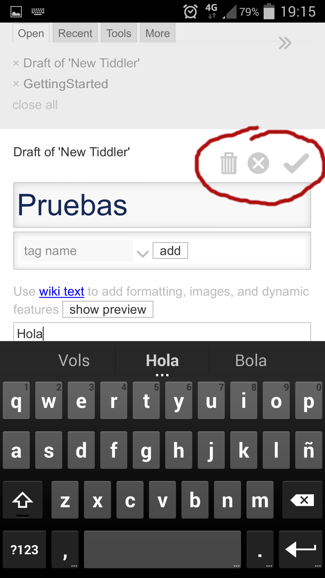 Cuando finalizo el contenido del Tiddler y termino de escribir, pulso el botón de OK (el de la derecha) entre los iconos de edición.