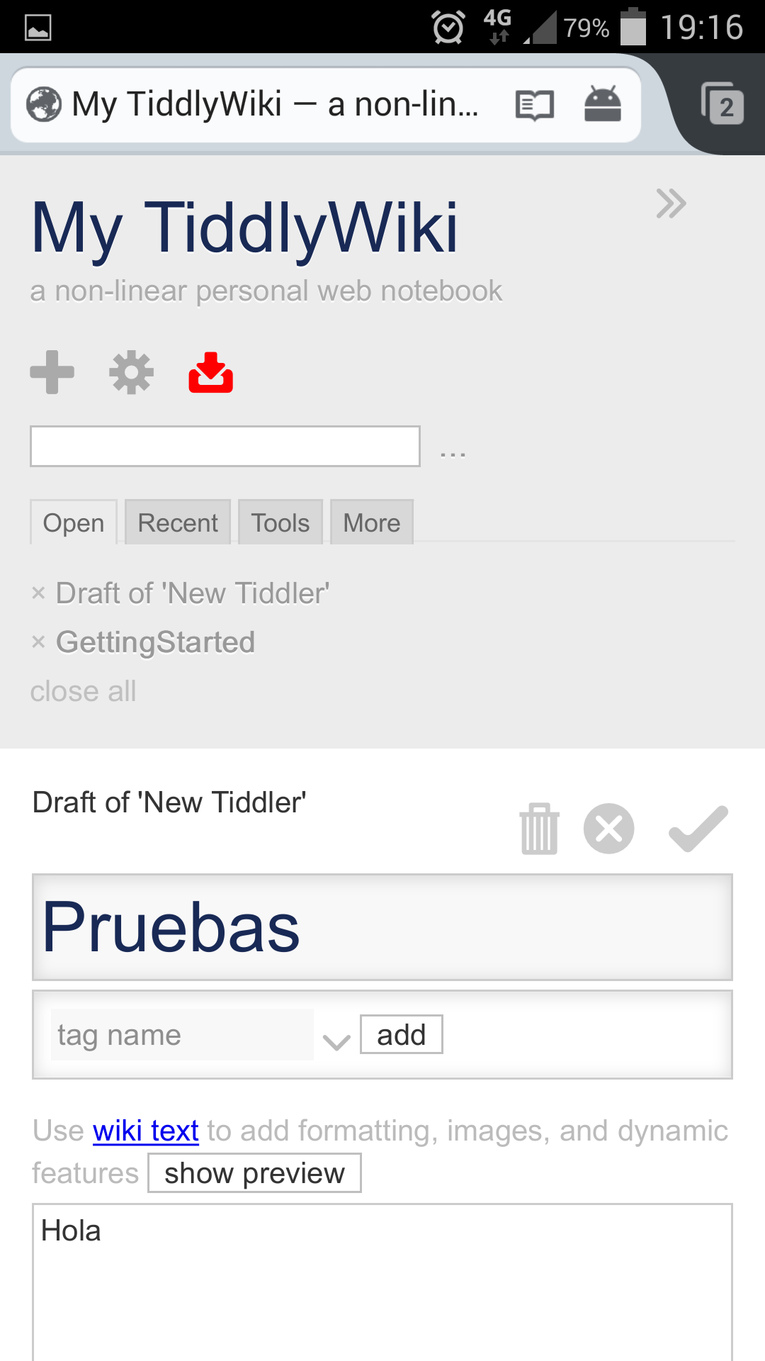 Una vez creado el nuevo Tiddler se ‘ilumina’ el icono de ‘guardar’, para que no se nos olvide consolidar lo nuevo que hayamos escrito.