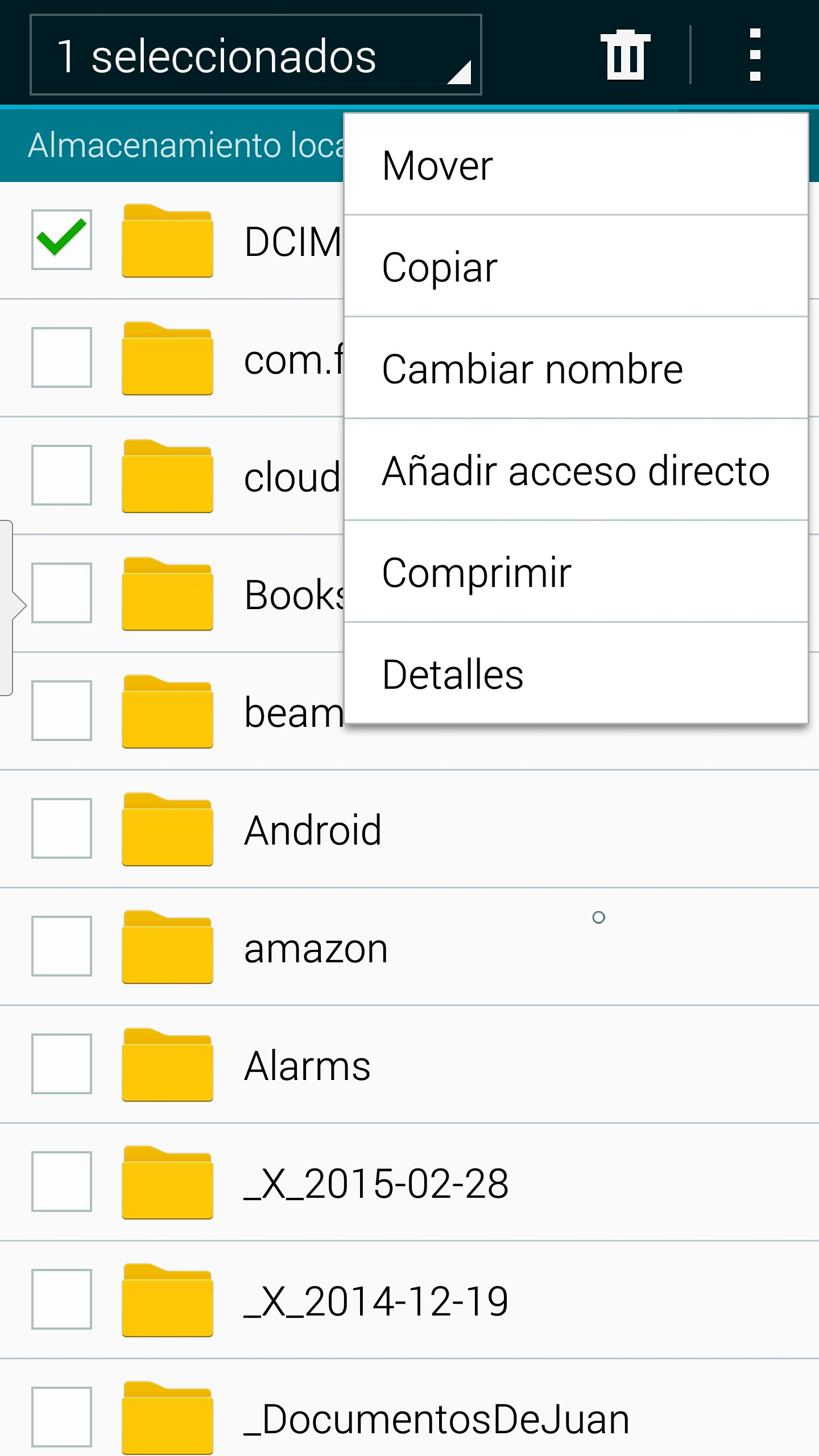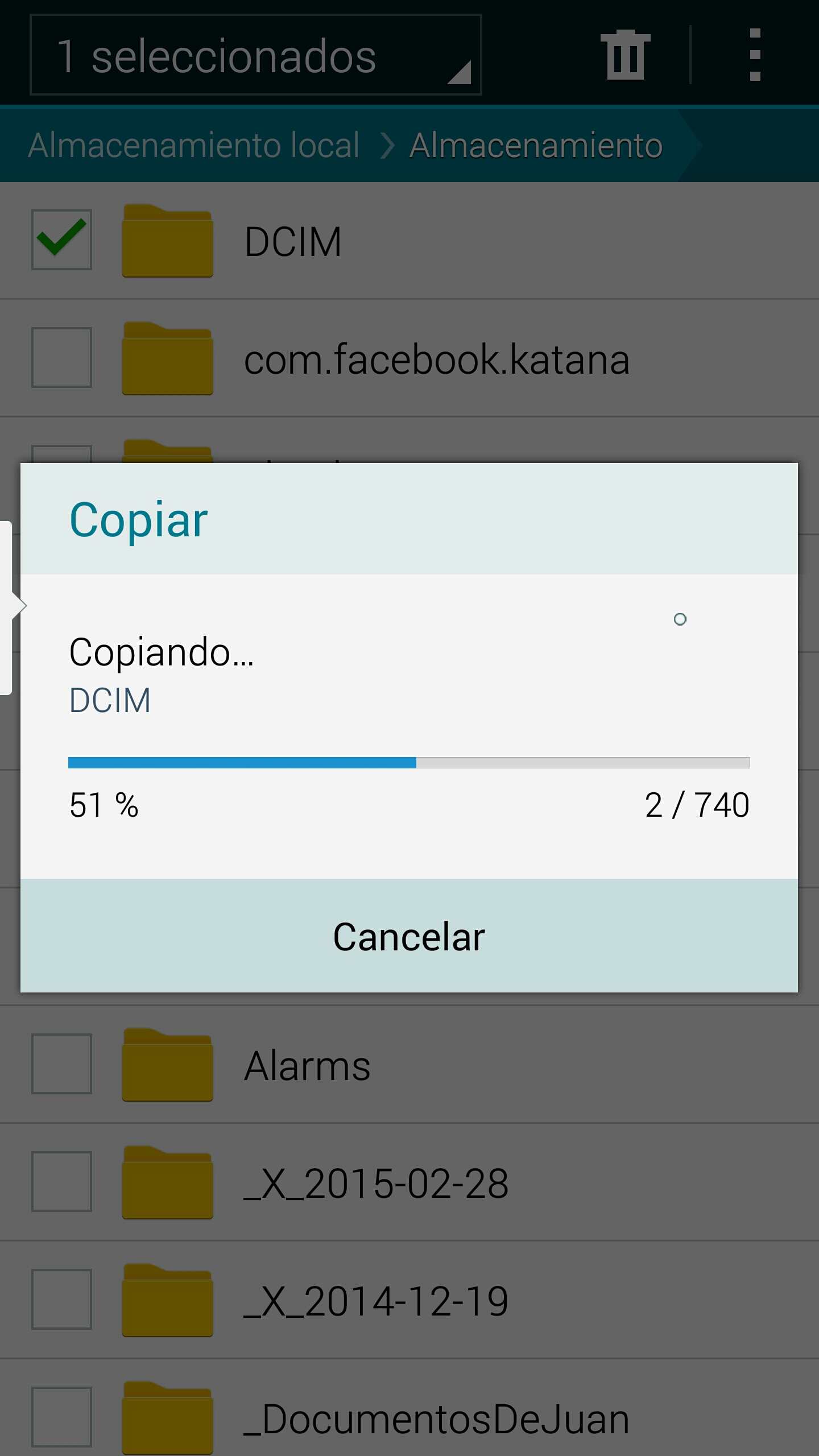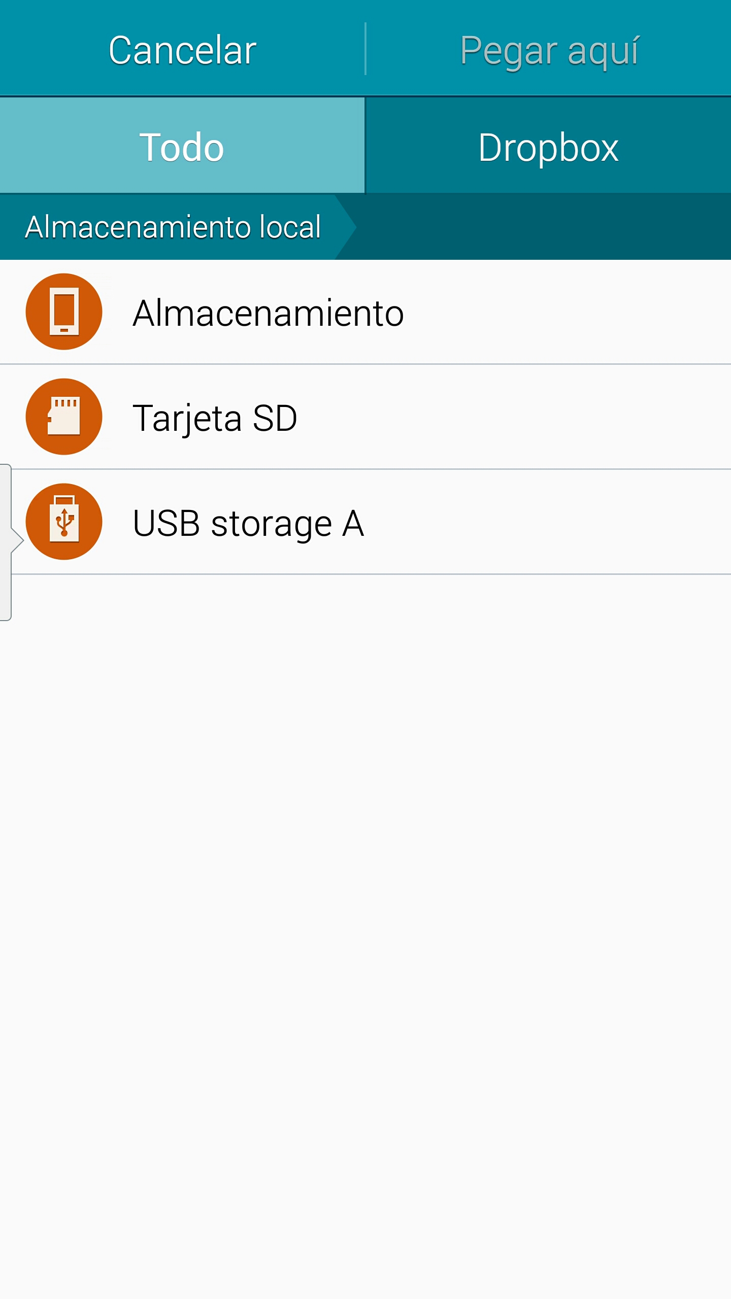 Una vez tenemos este pendrive se conecta al teléfono con su enchufe micro USB. Normalmente aparecerá un menú emergente con los archivos del pendrive. Se toca en el menú arriba en ‘Mis Archivos’ y se verán los tres directorios habituales ‘UsbDriveA’ o ‘USB storage A’, ‘SD memory card’ o ‘Tarjeta SD’ y ‘Device storage’ o ‘Almacenamiento’. Las fotos estarán en una carpeta DCIM o 100ANDRO bien en el propio teléfono bien en la tarjeta SD (los nombres de los archivos pueden variar según el teléfono o el sistema operativo). Si las fotos las tenemos en la memoria del propio teléfono en DCIM se elige ‘Almacenamiento’ y se busca DCIM. Se trata de copiarla en ‘USB storage A’.