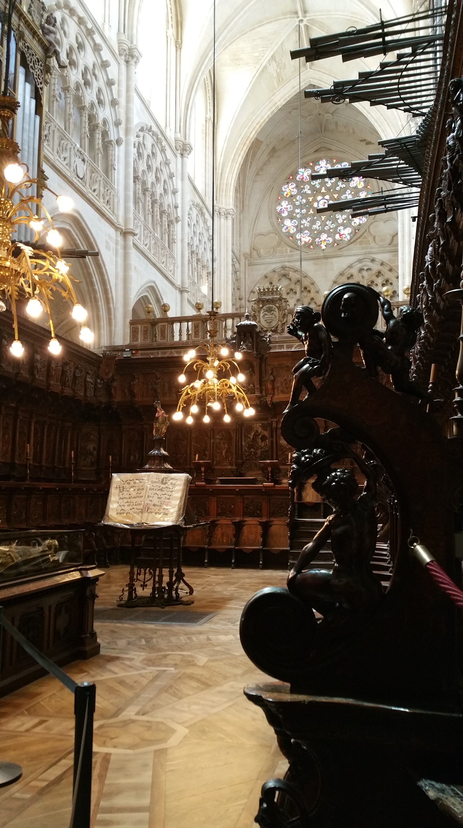 Catedral de Burgos – Detalle del coro de Felipe Bigarny, con los tubos de uno de los órganos sobresaliendo
