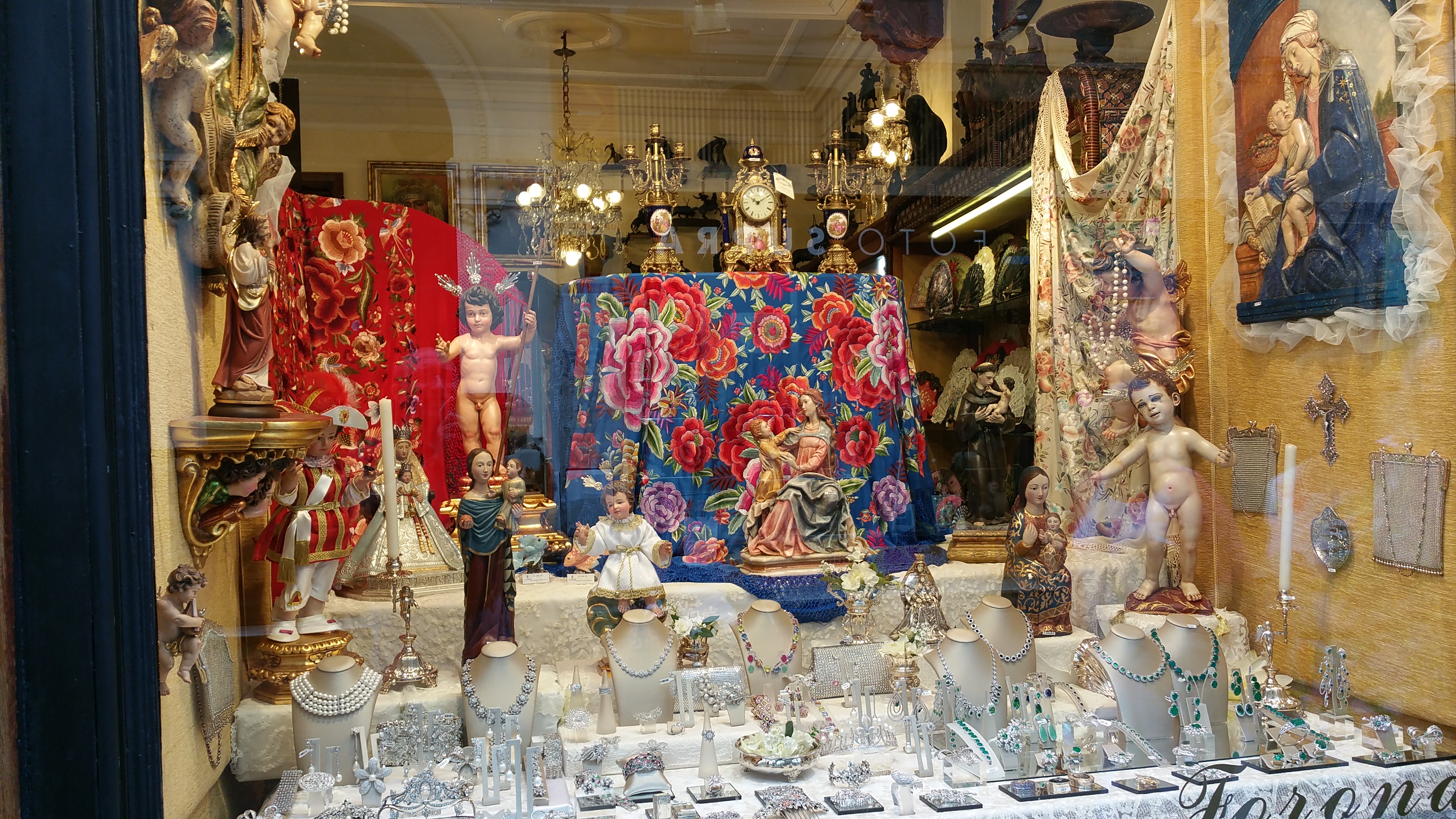 De día mejor estar a cubierto, o sea, ‘bajo palio‘, en las calles comerciales, repletas de tiendas que muestran sus joyas. Joyas en forma de mantones bordados, de abanicos y cerámicas pintados a mano, de sombreros, relojes, todo para el disfrute de una vida plácida y rodeada de abundancia. Costumbre, la de dar sombra con toldos en lo alto, que ya copian otras ciudades, como Madrid, sin ir más lejos. Sevilla son muchas ciudades en una. Ese es parte de su atractivo.
