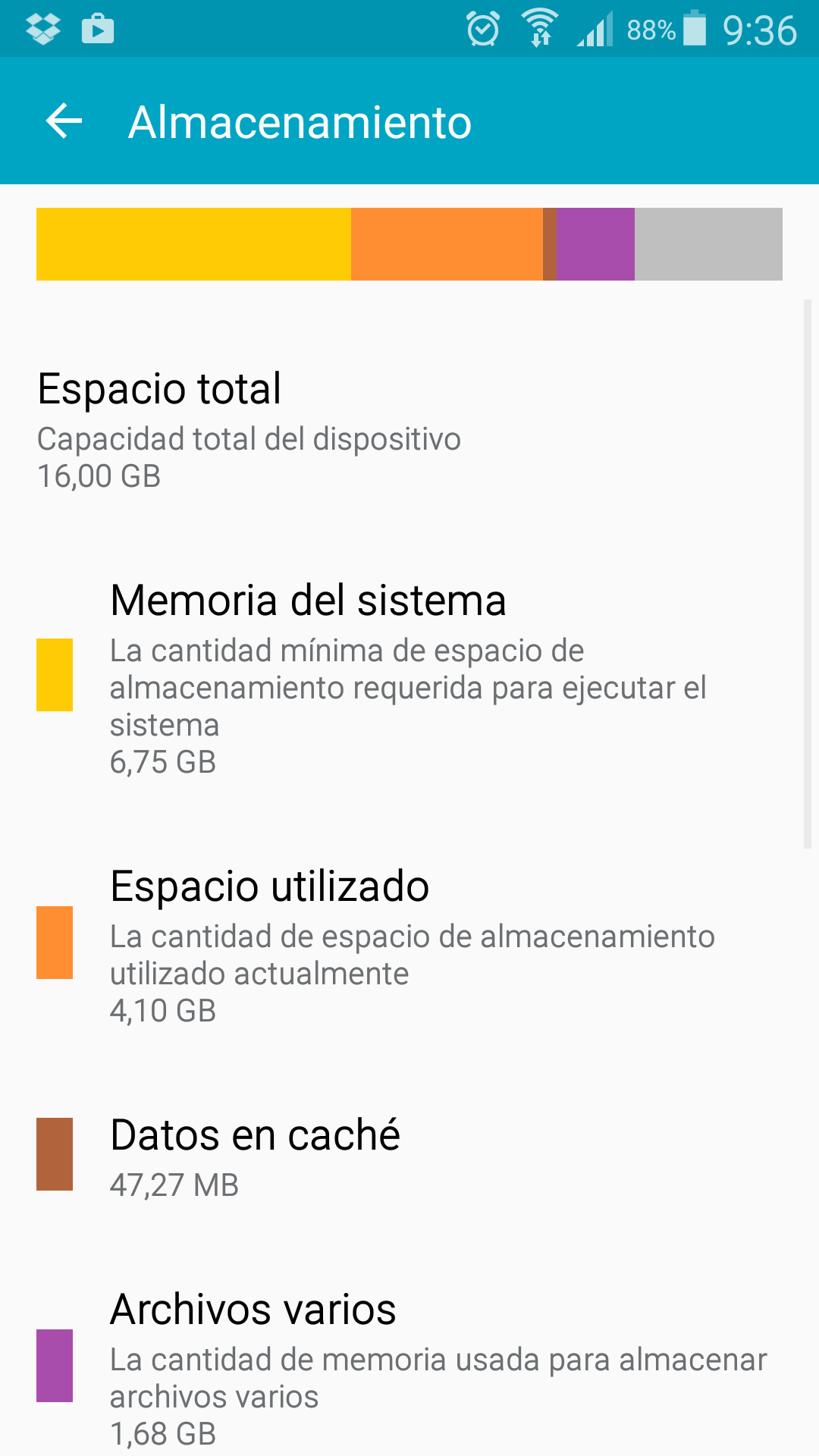 Con DiskUsage encuentras que hay algún directorio que tiene un tamaño desmesurado. Puede que grabaras allí un archivo grande y que quedara olvidado. Puede que una aplicación guardara una copia de seguridad. El caso es que con DiskUsage podemos saber donde se acumula la ocupación de tus lugares de almacenamiento, buscar los archivos grandes, decidir si son necesarios (ojo porque si se toca algún archivo que usa el sistema podría resultar en un mal funcionamiento del equipo, así que es mejor no tocarlo a menos que se sepa seguro que se puede manejar sin riesgo). Luego, con el gestor de archivos del teléfono o táblet se puede eliminar lo que deseemos. El resultado es un sistema de archivos limpio y más amplio, como el que se muestra en la última imagen: