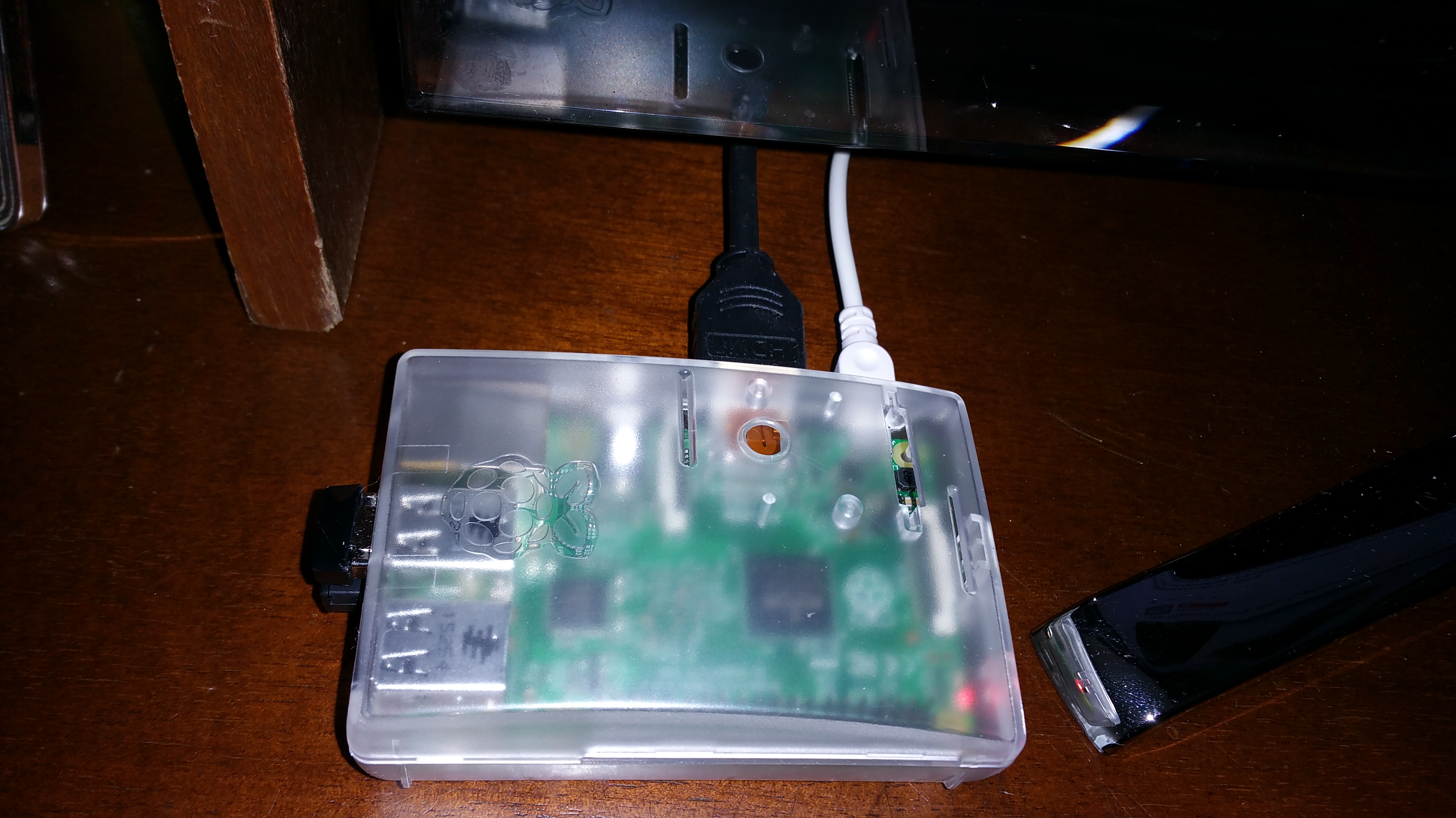 Raspi en la TV- Instalación: el cable negro es HDMI, el blanco es el de carga. Tiene dos adaptadores enchufados a dos de sus bases USB (a la izquierda): una tarjeta para conectar con la WiFi y otra para conectar con el teclado inalámbrico