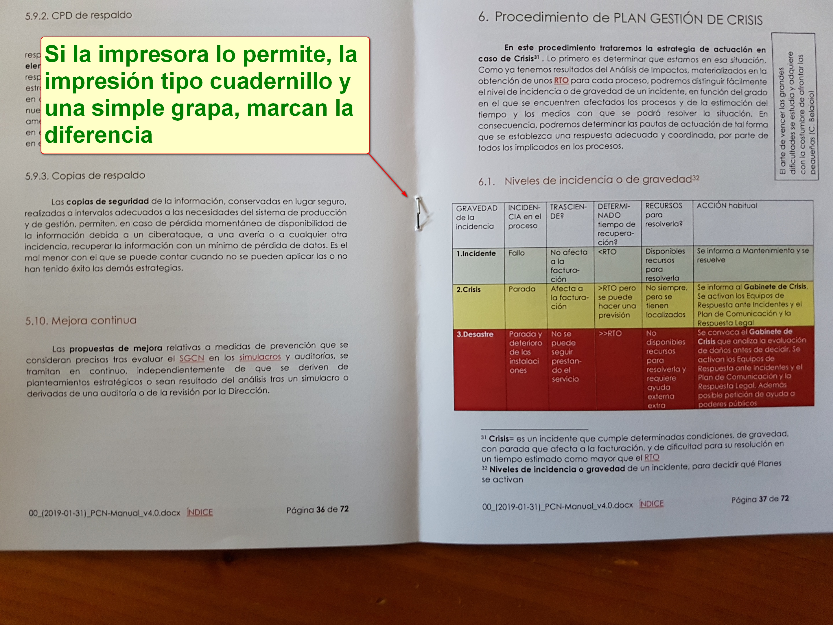 Lo mejor es lograr que todos los procedimientos esenciales de PCN estén concentrados en un único documento, El Manual, adoptando la forma de un pequeño librito. Para ello, la impresora ha de ser capaz de imprimir ‘cuadernillos’, partiendo de un documento de Word. Este modo imprime dos páginas del documento en cada página de papel, y lo hace a doble cara, transformando el documento en un ‘librito’ tamaño A5, con lo que una simple grapa en el centro, hace el resto. Queda un documento de ‘la mitad de tamaño’, manejable y agradable.