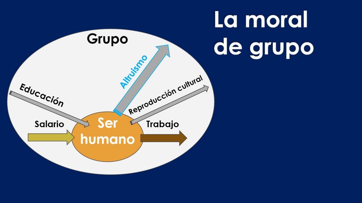 | La base de la moral de grupo es la acción altruista en beneficio del grupo. Este conjunto de interacciones de altruismo y prestigio o reconocimiento configura una relación del individuo con el grupo. Es algo semejante a las continuas interacciones del electrón en un átomo que se manifiestan como una unión estable. Un grupo se fortalece cuantas más relaciones de este tipo se crean entre sus miembros. El caso más notable es el de las relaciones de pareja. También las relaciones de tipo religioso. Los héroes son altruistas. A todo ello, si es continuado, le llamamos también ‘amor’. Pongamos ahora un ejemplo más prosaico. En la recepción del embajador, en la que hay ricos canapés en una bandeja, la tentación de asaltar la comida, digamos como un animal, es grande a una cierta hora, de ayuno, tras los discursos. El comportamiento del humano, en cambio, es ofrecer el contenido de la bandeja a los acompañantes cercanos y solo luego atacar los canapés. Con ello se tiene el reconocimiento de los amigos y se prueba que a veces la faceta humana prevalece sobre la puramente animal. |