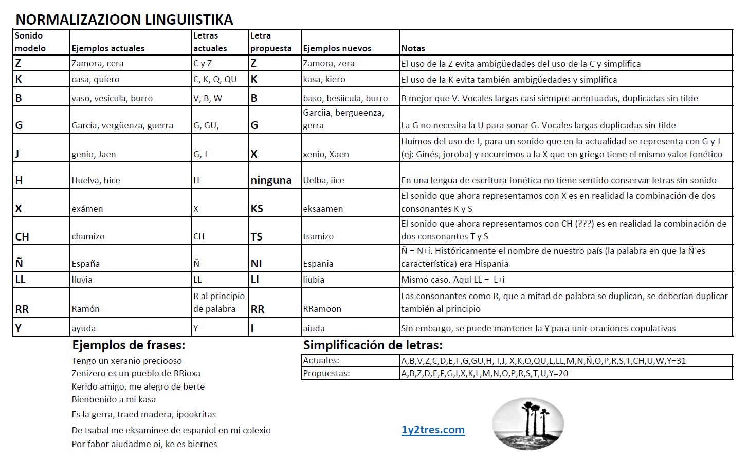 Propongo una simplificación radical de la escritura del español, quitando ambigüedades, mejorando la representación de vocales largas, evitando las tildes y las típicas faltas de b y v, de h y sin h, etc. Los 27 signos (letras) del español (entre ellos está la Ñ, que es más bien rarito) y la H que no suena. Se complican aun más, empleando otros ‘dobles signos’ o ‘dobles letras’ necesarias para representar ciertos sonidos y que en la práctica se convierten en un solo signo, como GU, QU, LL y CH, sumando así 31 en total. Todo esto dificulta el aprendizaje de la lengua. Sin hablar del ceceo y del seseo que se emplean en amplias zonas del sur, del laismo y loismo que se emplean en Castilla, del uso del condicional en lugar del subjuntivo que se emplea al menos en las tierras vascas y de Burgos… La simplificación propuesta separa un sonido por letra, que se han de juntar sólo si un sonido es combinación de otros dos y viene detallada en la siguiente tabla: