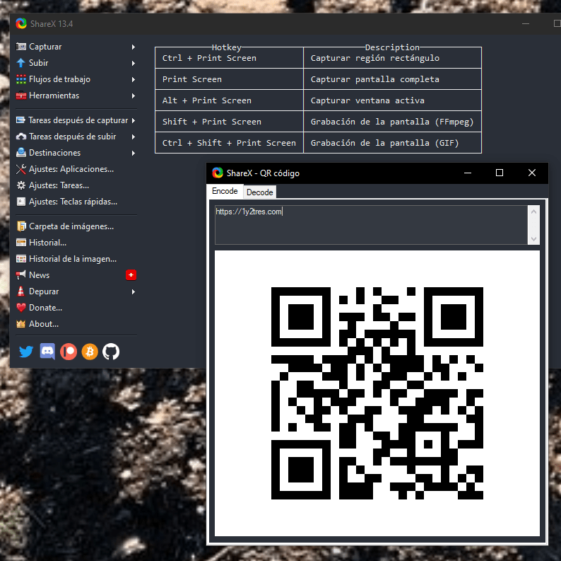 ShareX, el tercer programa que os incluyo es bastante más completo, y está indicado para compartir contenido web. Pero en sus herramientas está la posibilidad de crear y de leer códigos QR.