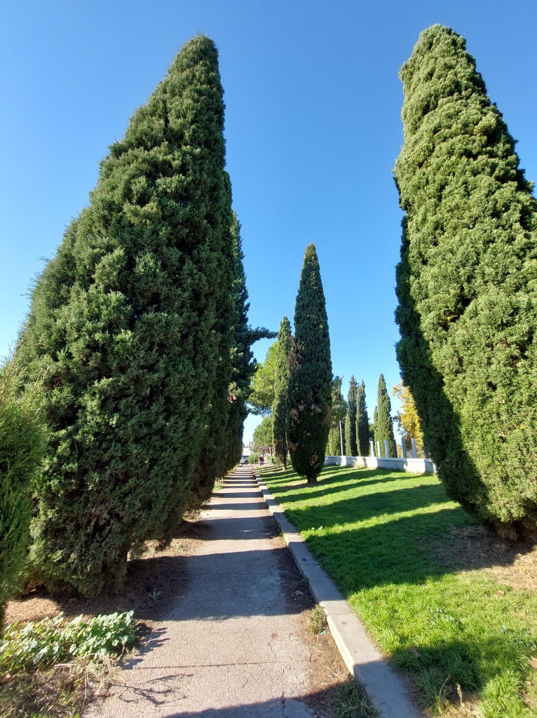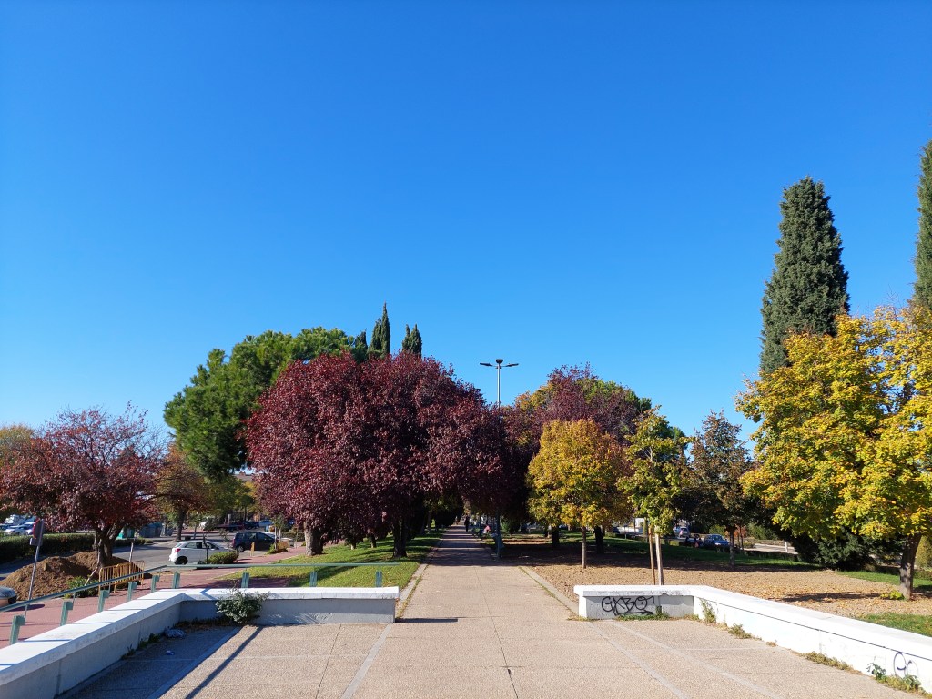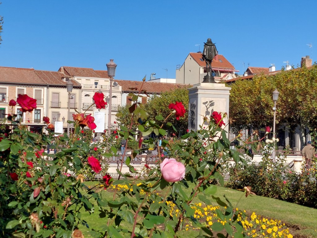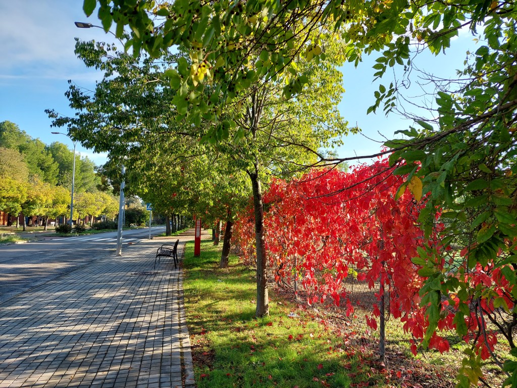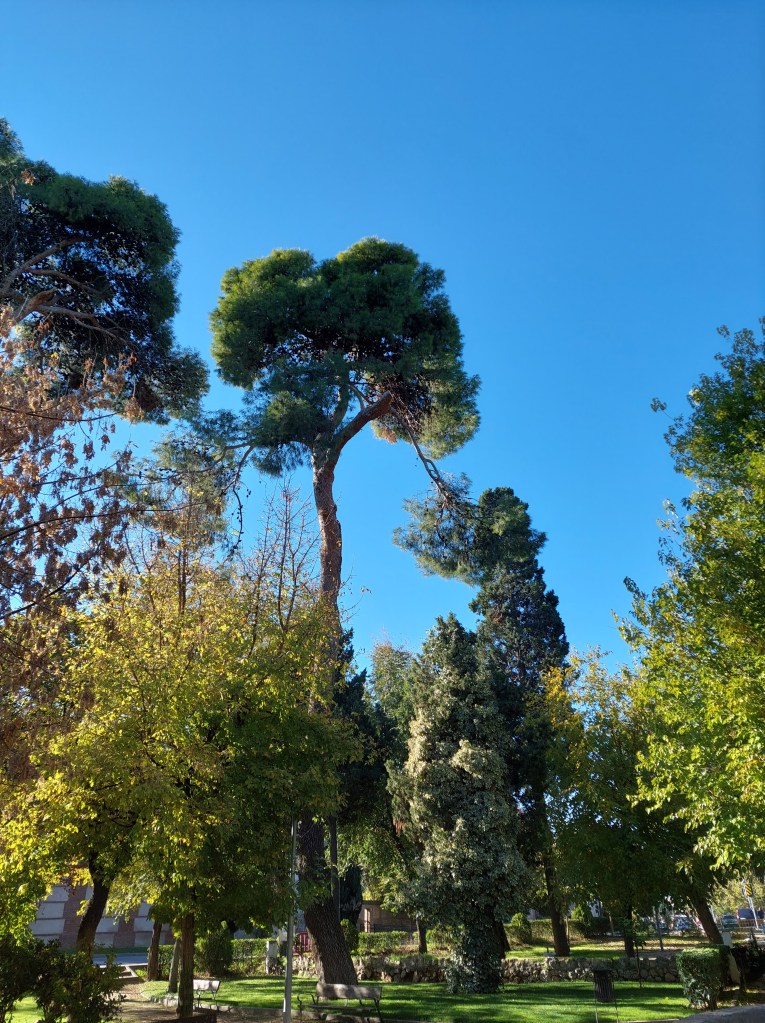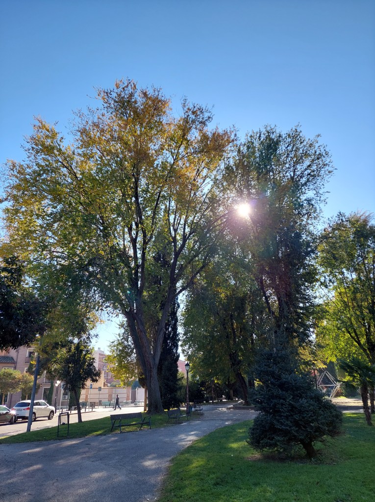 Sin ser exhaustiva la relación, tenemos árboles en parques (el cuidado y multifuncional Parque O’Donnell, las riberas del Henares, sus paseos y pasarelas junto al río, los dos parques del Chorrillo (Reyes Magos y Camarmilla), el Arboreto Reyes Católicos, el fantástico campus de la Universidad y del Hospital Universitario, el Gran Parque de los Espartales, el Real jardín Botánico de Juan Carlos I), pequeños parques y jardines (el de los Jesuitas, el de frente a la Universidad Laboral, otros, el Jardín de las Palabras cerca de la Catedral, un delicioso jardín recogido en la misma Vía Complutense, otro, junto a la Ermita San Isidro, tras el Carrefour del centro, el Parque de Sementales, el Parque de Santa Ana, el de Tierno Galván, el de Juan Pablo II, etc.), plazas (como las del Palacio Arzobispal, la de Cervantes), calles arboladas por todas partes, empezando por el acceso de la ciudad en la calle de Madrid, el paseo de los pinos, multitud de rincones en todos los barrios, en el Val, incluso junto a las vías del tren… Cualquier enumeración se queda corta. Y me dejo muchos nombres.