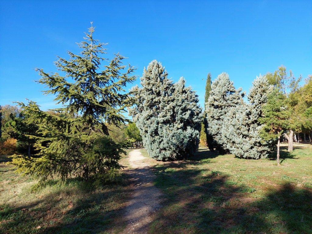 Árboles resinosos, árboles frondosos, pinos, cedros, cipreses, abetos, platanos, castaños, prunos, magnolios, moreras, álamos. También palmeras, porque el clima lo permite. Con una asombrosa diversidad de especies y con colores en armonía, pintando todo el arco iris.