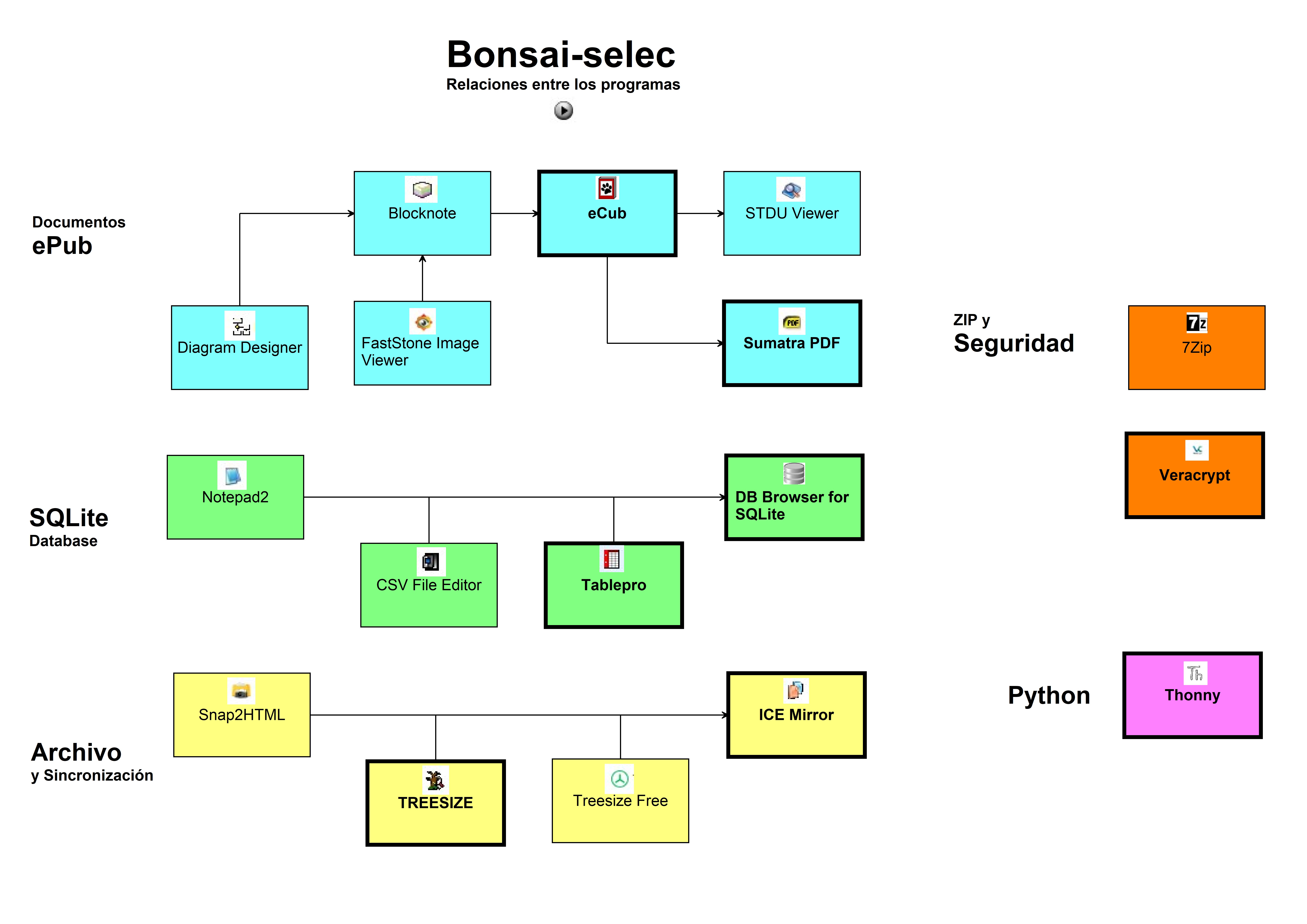 Algunas de estas y otras aplicaciones me han acompañado ya un par de décadas, y mis colecciones o ‘jardines’ hechos con ellas han variado de componentes y tamaño, pero algunos de estos programas siguen funcionando, en algún caso años después de que ya nadie los mantenga, por lo que algunos son difíciles de encontrar. Sin embargo voy a hablar de 5 ‘líneas’ de trabajo con pequeñas aplicaciones, que aún tienen mucho que ofrecer. A estas líneas de trabajo las llamo: ePub, SQLite, Archivo, Seguridad y Python. Como veis, tres de ellas tienen nombres propios.