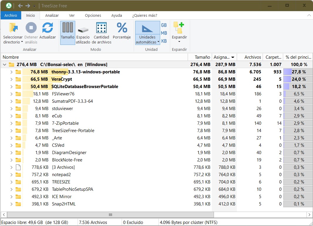 El conjunto de estos programas, desplegado ocupa muy poco, para lo que da de si. Veamos la lista con datos de tamaños que crea Treesize Free (el tamaño exacto real de los archivos puede variar por el uso de versiones distintas o actualizaciones pero da una idea del volumen relativo de cada programa): Thonny, Veracrypt y DBBrowser for SQLite ocupan tanto como las otras 14 aplicaciones. Aún así, todos juntos ocupan lo mismo que puede ocupar un solo programa ‘convencional’. En conjunto menos de 300 Mb.