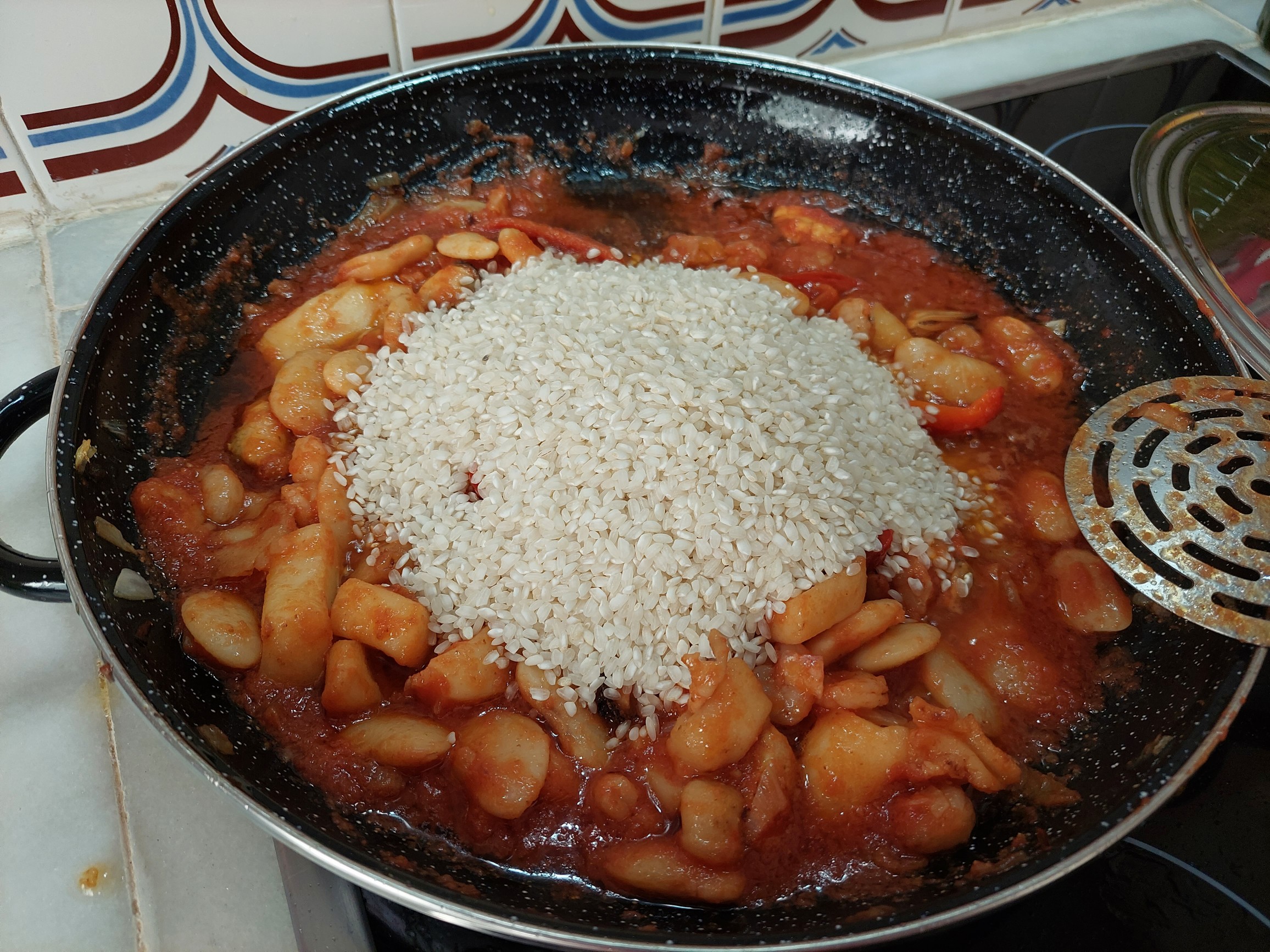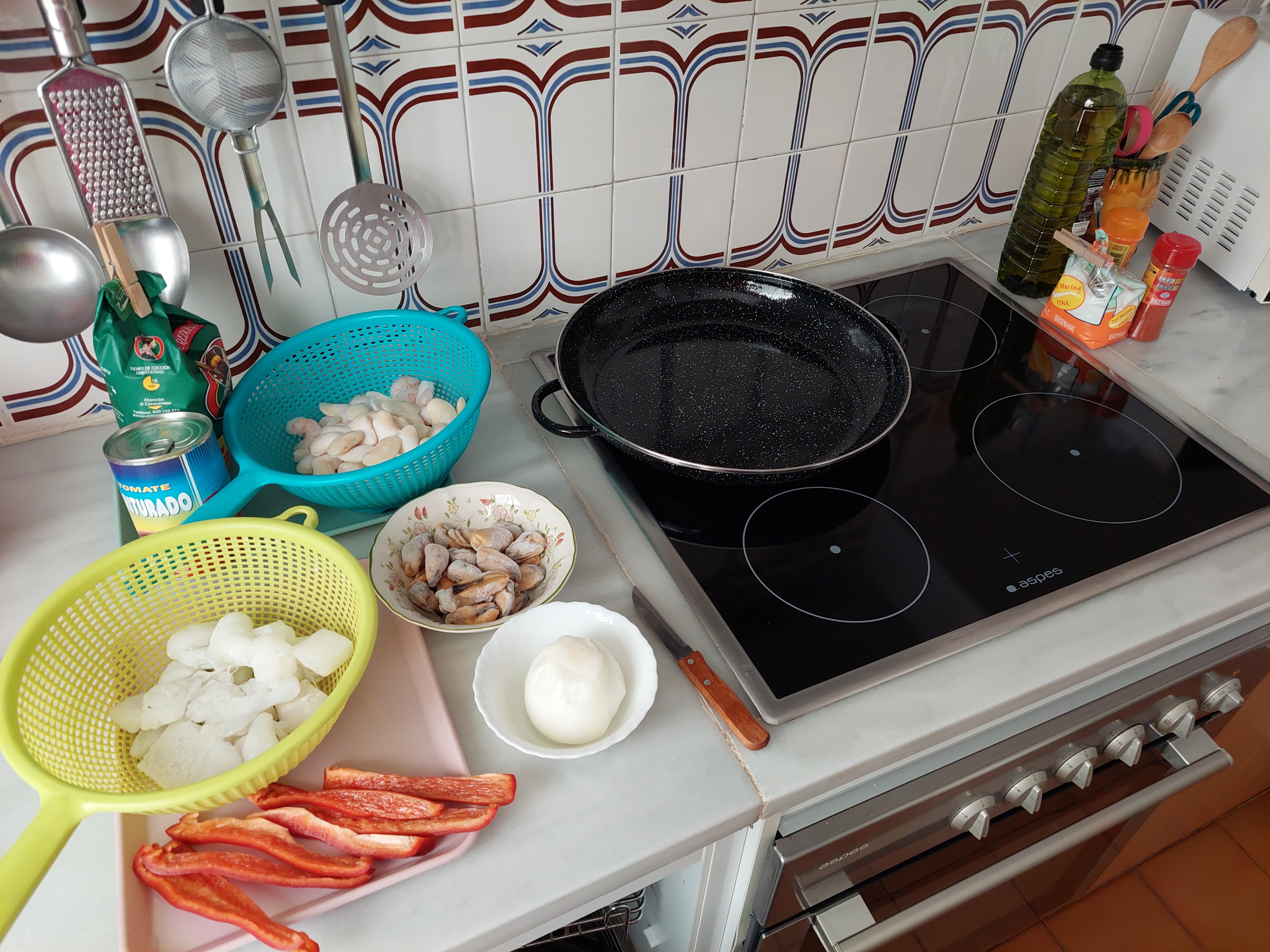 En este caso tendremos también en cuenta que el cocinero lo tenga fácil y no necesite ningún conjuro para cumplir con las normas. Lo de ‘calibre 35’ hace referencia al paelló a emplear, que, para aprovechar el máximo de la vitrocerámica, mide 35 cm de diámetro. Con este ‘caldero‘ se pueden hacer 6 raciones, por lo que basta para una familia de 6 miembros, o para 3 que repitan a los dos días los otros 3 platos hechos de más. Vereis que empleo uno con recubrimiento cerámico para que no se le agarre el arroz y sea más fácil de limpiar.