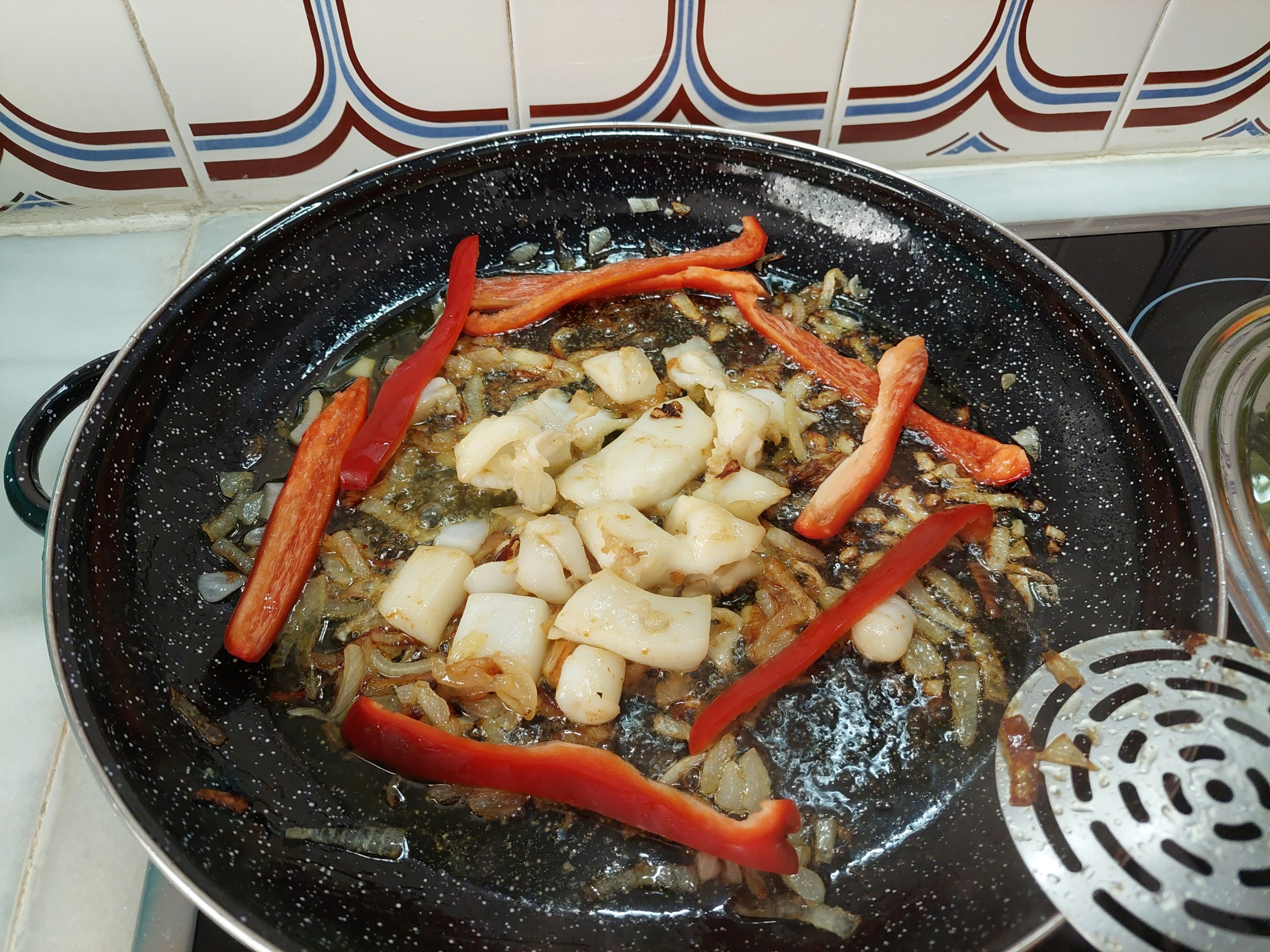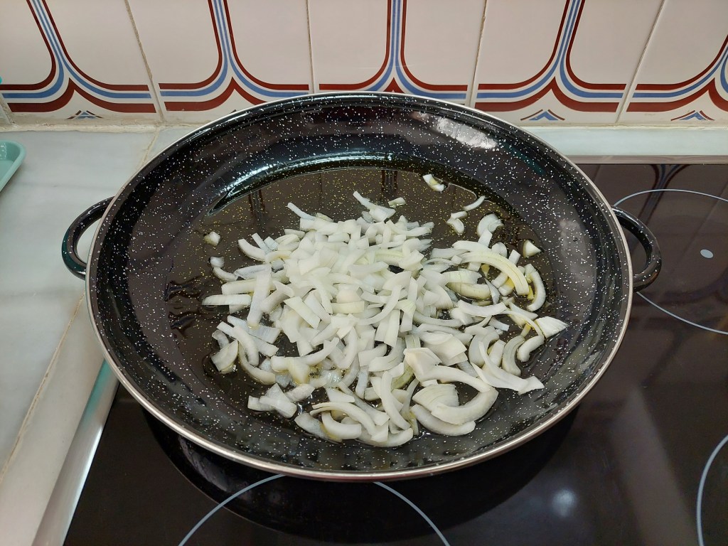Pero se ha de empezar por algo y hacerlo bien. La idea es que los componentes se van añadiendo en orden, empezando primero por los que necesitan más tiempo de cocción o más temperatura, para ir completando el conjunto sin sacar nada del paelló. Este orden se ha ido estableciendo por la práctica y hace que las cosas salgan bien. Lo primero es sofreir la cebolla a fuego moderado en el aceite, revolviendo lo de abajo arriba con la paleta a intervalos para que no se queme.