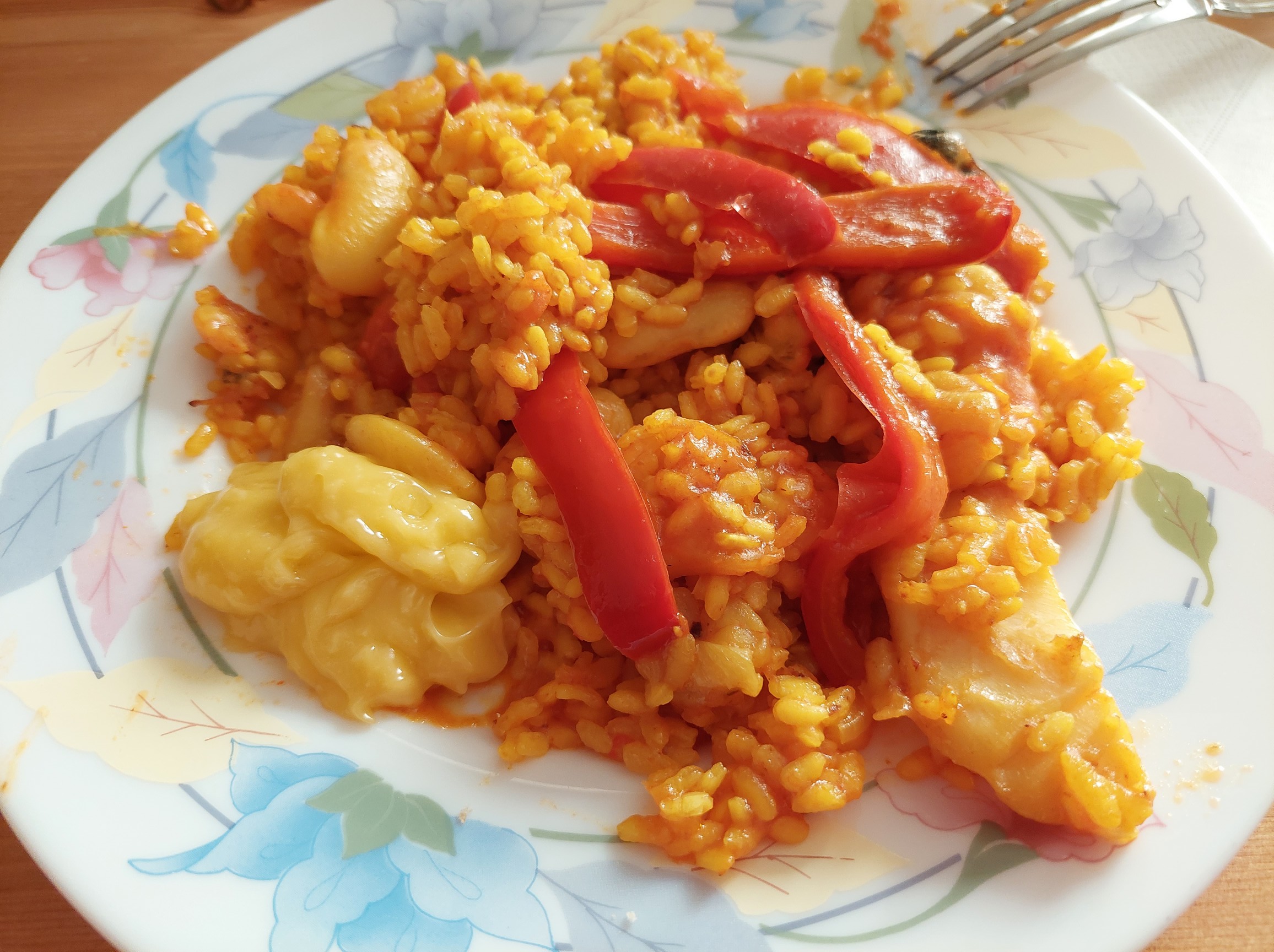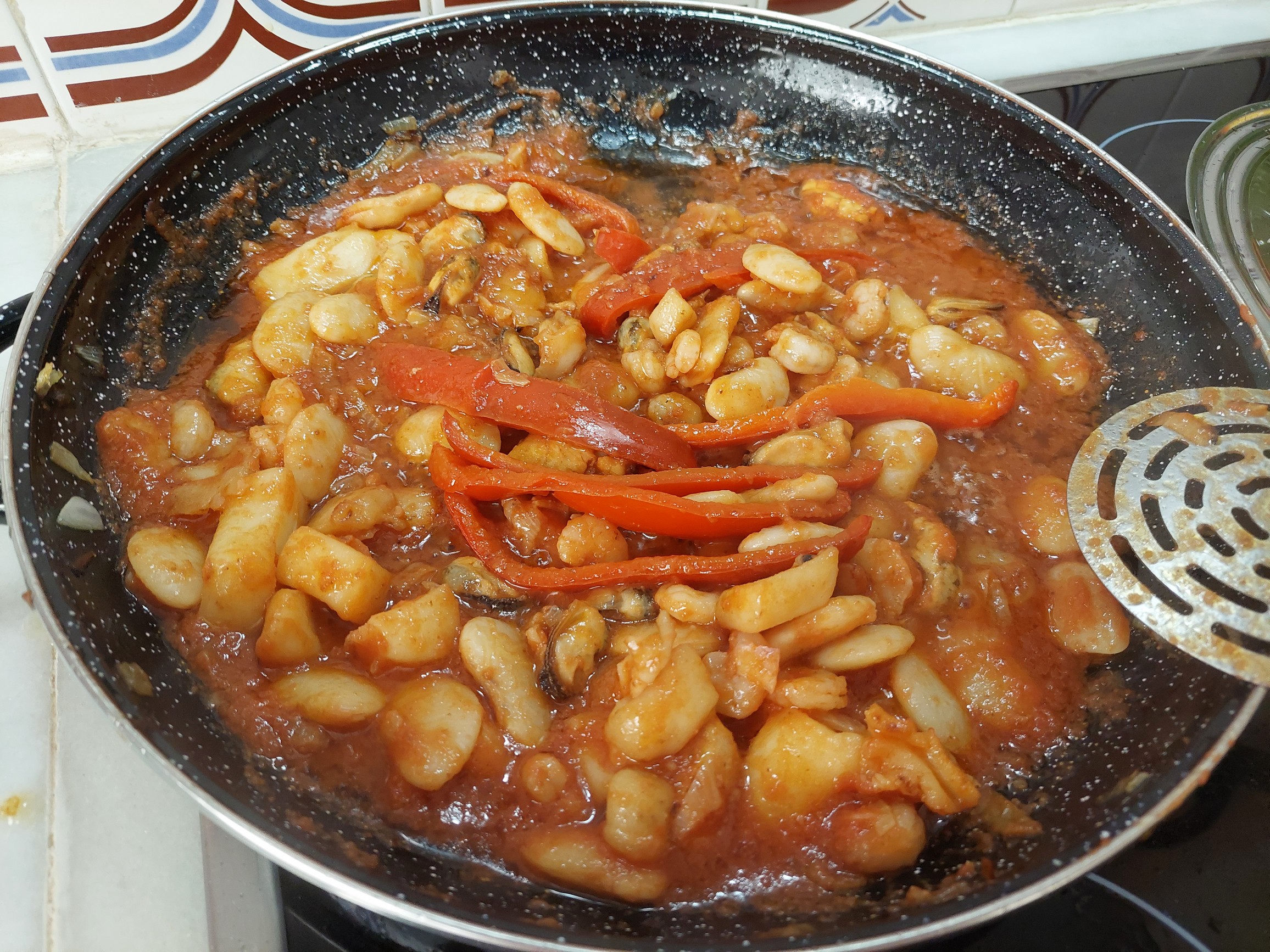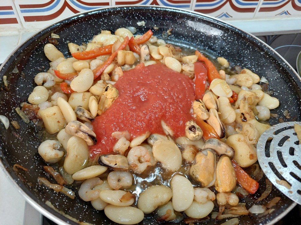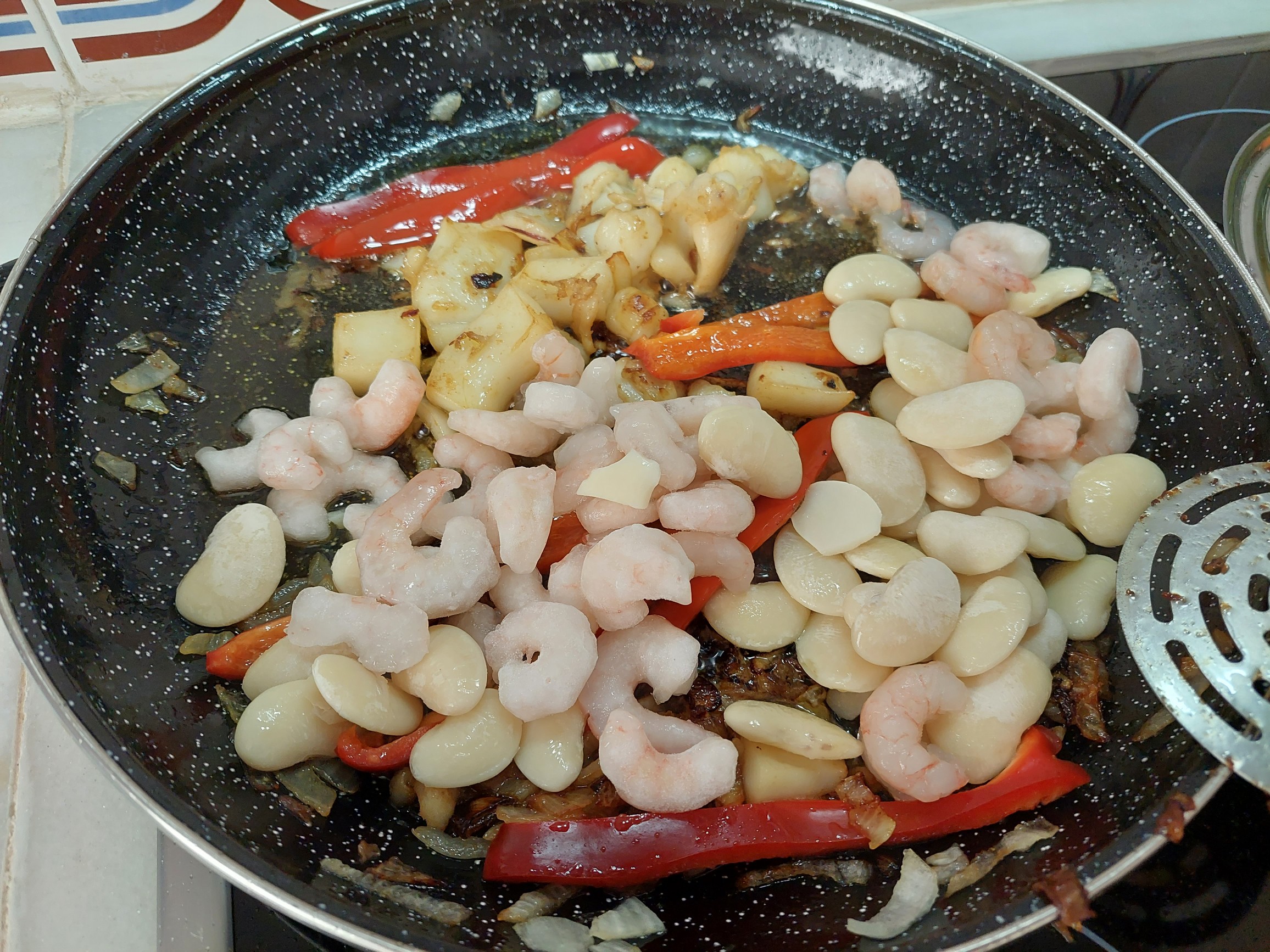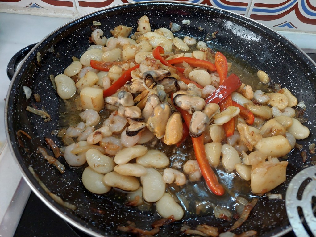 Estos componentes, gambas y garrofó, que estaban descansando juntos, están crudos por lo que requieren un poco mas de cocción.
