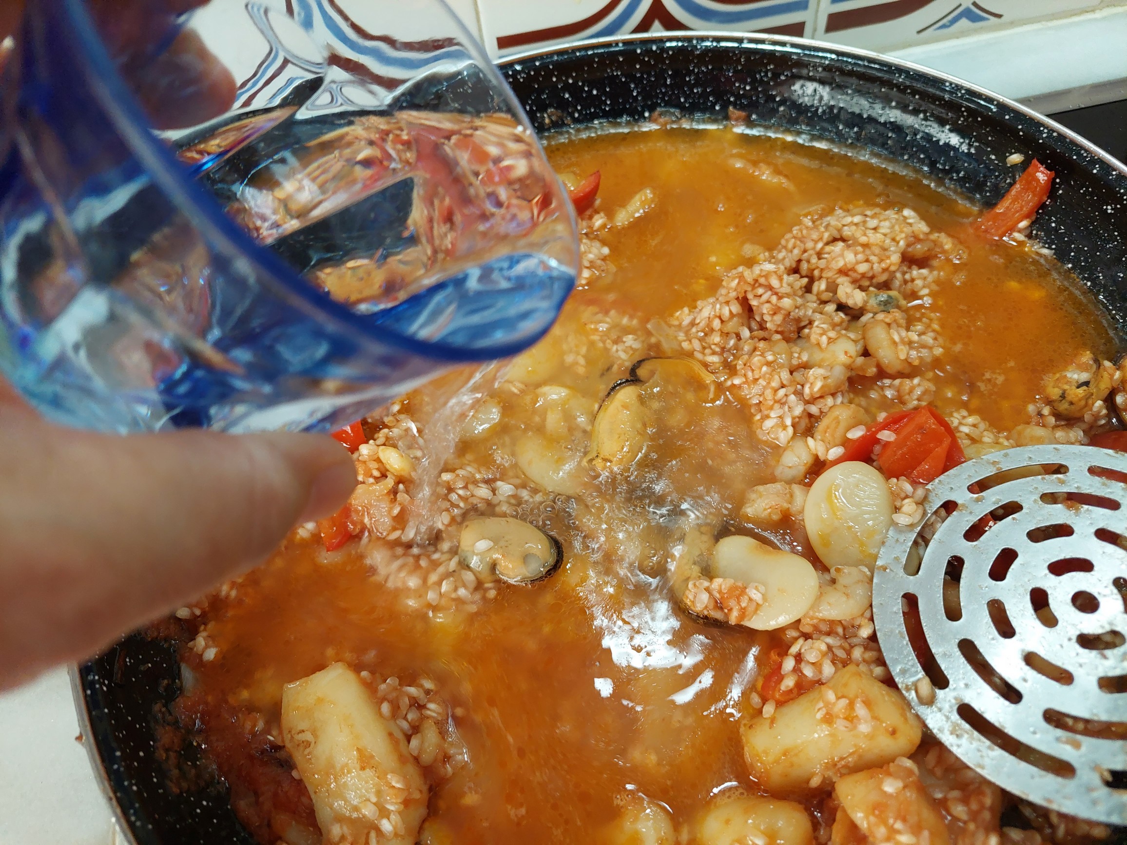 Hay que añadir una cantidad de agua suficiente para que se cocine en su punto el arroz, pero sin que quede caldoso. Para la cantidad de arroz que hemos puesto, bastarán de entrada tres vasos de agua y estar a tentos por si hubiera que añadir un poco más en caso de que el arroz se la haya bebido toda y aun no esté suficientemente cocido. Al añadir el agua, se enfriará todo el conjunto. Durante un par de minutos, solo hasta que vuelva a hervir, se pone la cocina más fuerte, digamos al 5 o 6. Y entonces hay que reducir el fuego al 3 y luego al 2 o al 1 jugando con el tiempo y la cantidad de caldo.