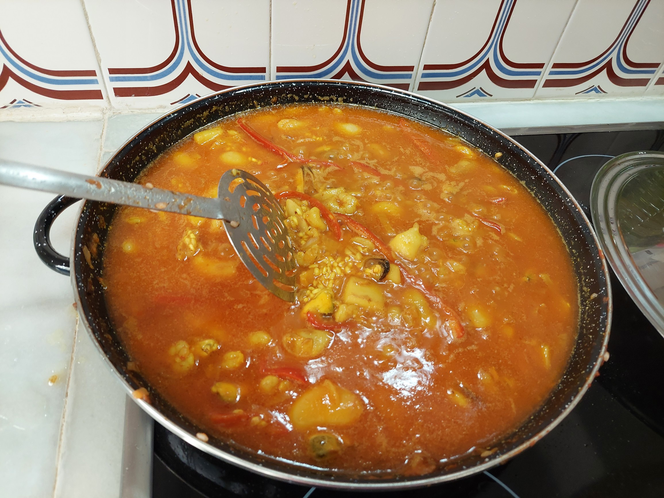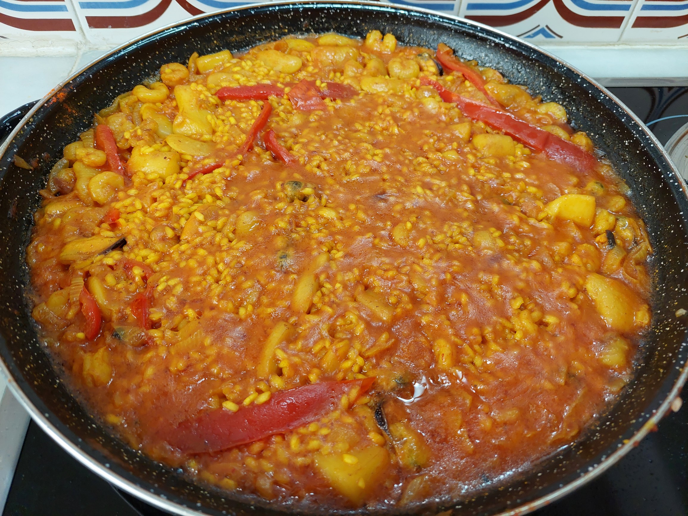 Taparemos el paelló cuando empiece a salpicar. Sin descuidar el remover su contenido para que se sofría bien.