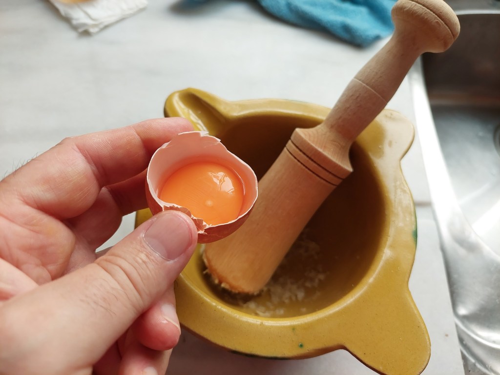 Esta salsa, típicamente valenciana se prepara machacando en el mortero un diente de ajo con una pizca de sal, añadiendo una clara de huevo y removiendo poco a poco agregando aceite al ritmo que se va ligando, según ‘lo pida’ el propio mortero. Si la maza gira muy pegada, se añade un poco de aceite y si gira muy fluida, se voltea y voltea para que se ligue más y así hasta tener la media docena de cucharadas que nos hará falta para las 6 raciones. Esta parte es opcional, pero supone el detalle distintivo entre tener un plato bien hecho y excelentemente hecho.