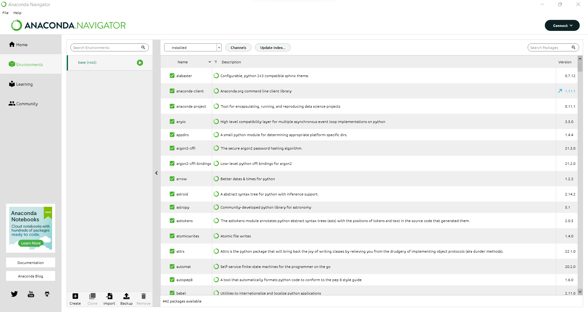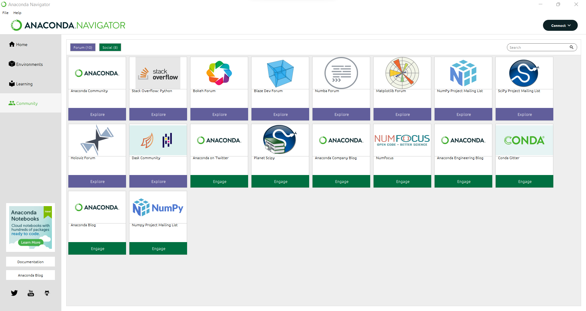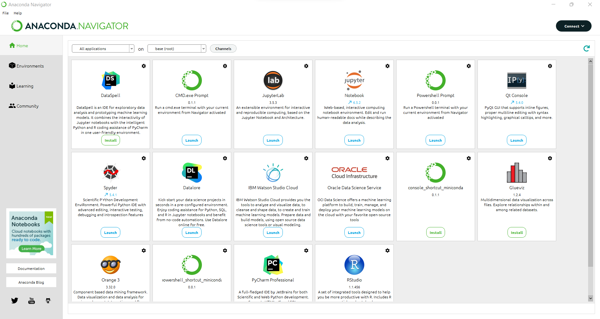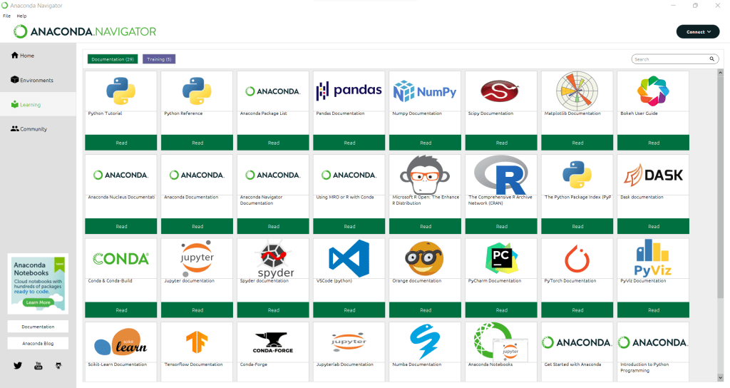 Sensatez es empezar por el principio: elegir una distribución de Python que ofrezca un máximo de prestaciones y cursar antes que nada un sólido proceso de aprendizaje. Anaconda es entonces la distribución de referencia, porque además de tener versiones para los principales sistemas operativos de PC (Windows, Linux y MacOS), su ‘escritorio’ es una herramienta muy estructurada y útil para introducirse a fondo en el mundo de Python. Encontramos de hecho cuatro páginas que forman el escritorio de Anaconda (Anaconda Navigator) que colman todas las opciones:
