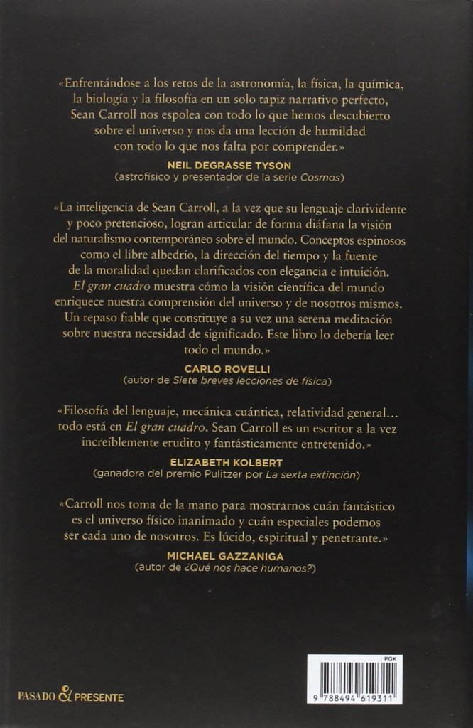 Mi primer post tras el verano en este escenario es para invitaros a leer y disfrutar ahora un extraordinario libro de divulgación científica de Sean Carroll, del que podemos ver otra reseña (de metahistoria.com), en el siguiente enlace «El Gran Cuadro«. Es de las pocas lecturas que me han hecho perder alguna hora de sueño para conocer, sin esperar a mañana, cómo termina algún capítulo que estaba leyendo en ese momento. No necesitarás manejar complicadas fórmulas matemáticas, ni siquiera ser un experto en Filosofía o en cualquier disciplina sobre ciencias de la naturaleza, ni tener una sólida base en ciencias sociales. De una forma casi imperceptible, el autor te lleva de la mano a conocer los entresijos de lo que el mismo define como Naturalismo Poético.