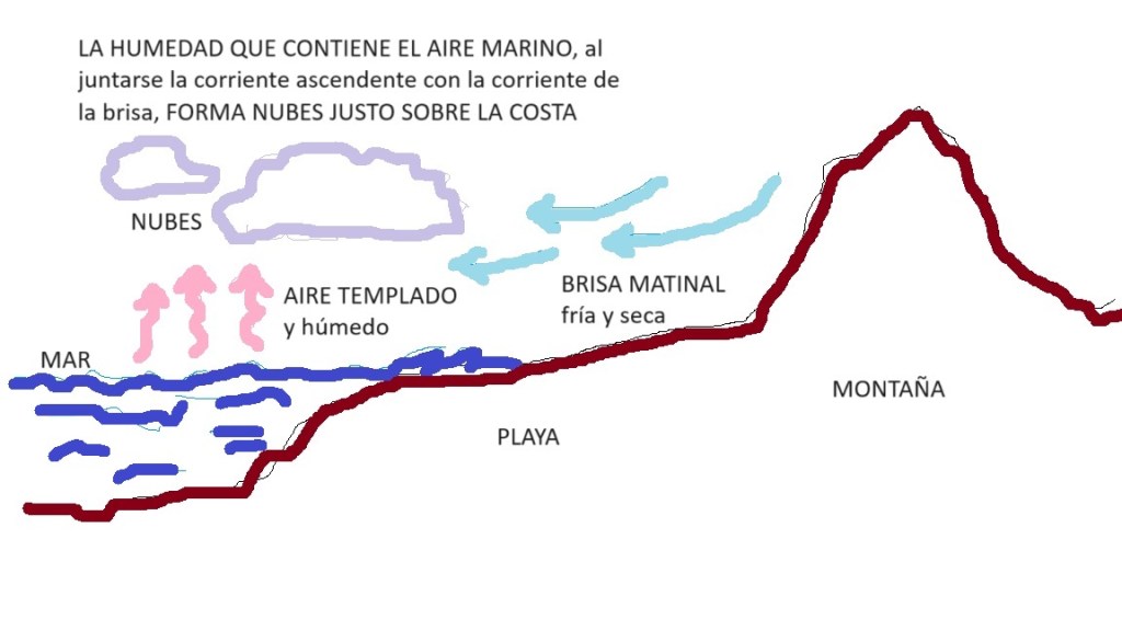 Por tanto, de madrugada tenemos dos corrientes de aire: una vertical templada y muy húmeda y otra rasante de la tierra al mar, fría y seca. Cuando se juntan, la humedad del aire templado que asciende, en lo alto sobre la costa, se condensa formando las nubes costeras matutinas. Estas nubes se van disipando a medida que las dos corrientes de aire van igualando sus temperaturas (y acaban cambiando de sentido, cuando la tierra llega a estar más caliente que el mar). Así que normalmente a media mañana las nubes van ‘deshilachándose’ literalmente con ayuda del sol del verano. Al cabo de un rato, ya no hay nubes y el calor aprieta de acuerdo según lo que manda la temporada.