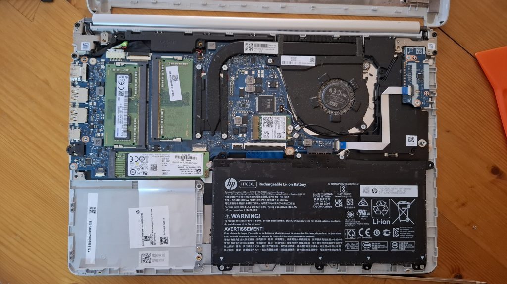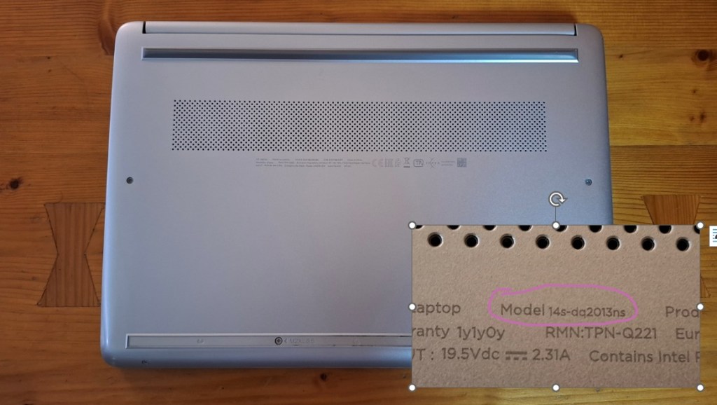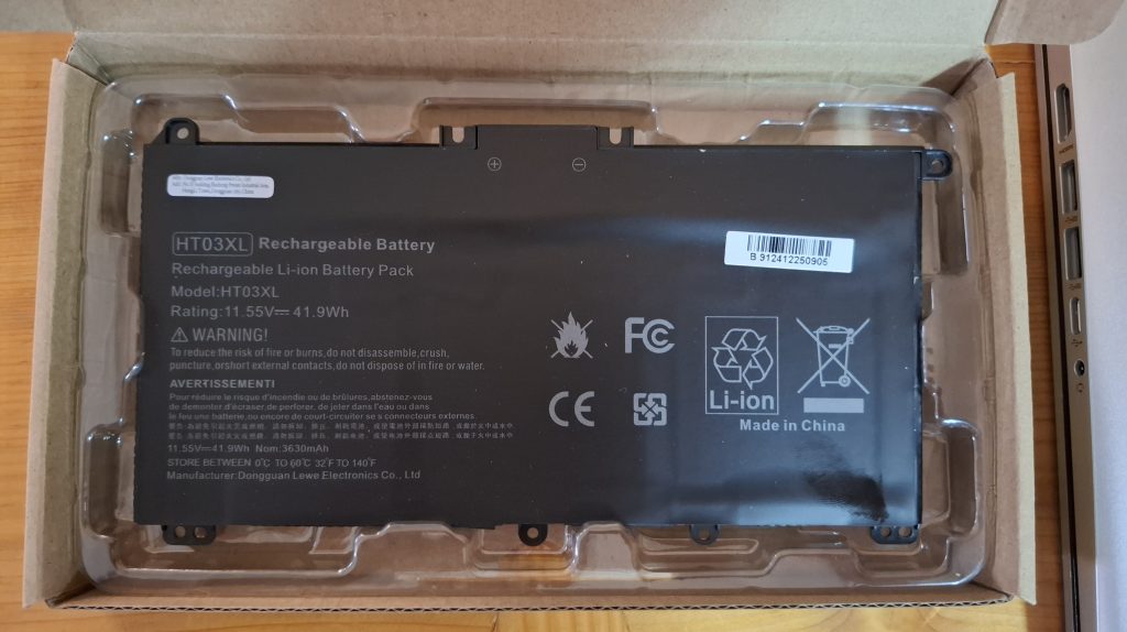 Los rastros e indicios vienen en forma del nombre del modelo impreso en letras minúsculas en medio de una jerga bastante ilegible. Una investigación en Google conduce con una alta probabilidad a identificar el modelo del repuesto. Varios videos de youtube muestran el proceso operativo del reemplazo. Anima ver que los videotuberos supuestamente expertos no son unos manitas, y uno (o sea yo) con sus propias manos y sin experiencia previa quizá pueda tener éxito con el desmontaje (y montaje posterior) sin daños. El combustible para la operación es que un PC semejante anda hoy en día por más de 1.000 €, que ya escuecen un poco, y una batería, aun con riesgo de que no sea la que toca está por menos de 30 €.